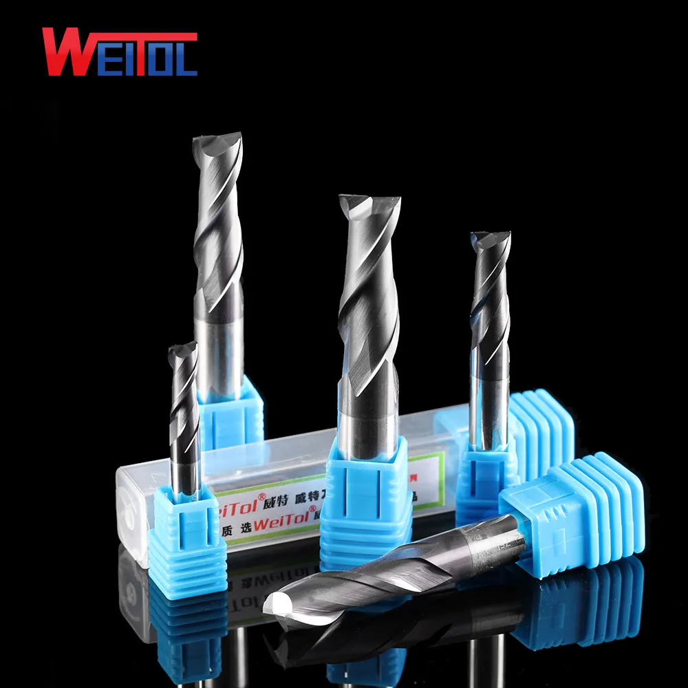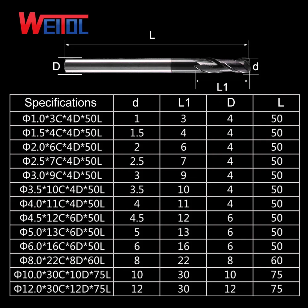 Фреза Weitol HRC50 из карбида вольфрама с черным покрытием, фреза с плоским дном и двумя зубьями для ЧПУ, 1 шт.
