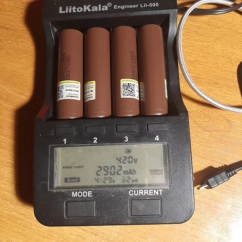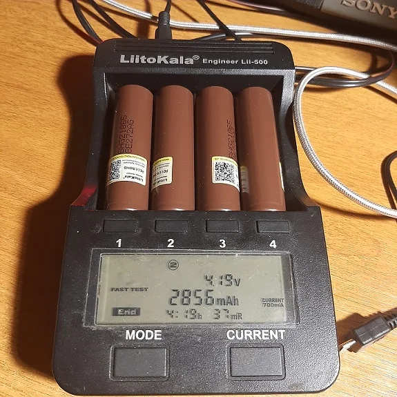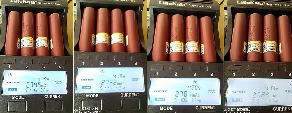 Пришли полуразряжеными с напряжением 3.6В. Емкость соответствует 2900-3000мА. Первый аккумулятор разрядил не полностью поэтому 2600мА, остальные после полного разряда взяли 2900-3050мА. Очень долгая доставка 82 дня, транспортная компания mist express.