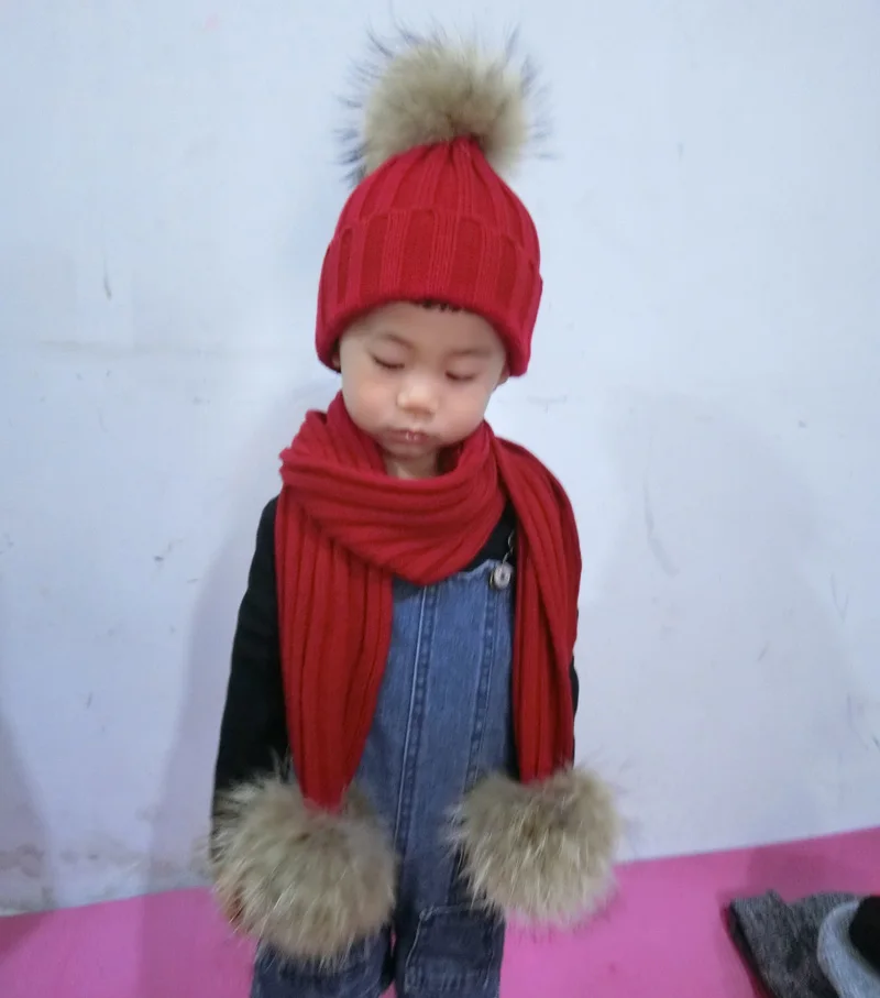 Детский зимний шарф и шапка, теплый плотный эластичный вязаный набор шапочек-бини, шапка с помпоном из натурального меха и шарф, комплект для детей
