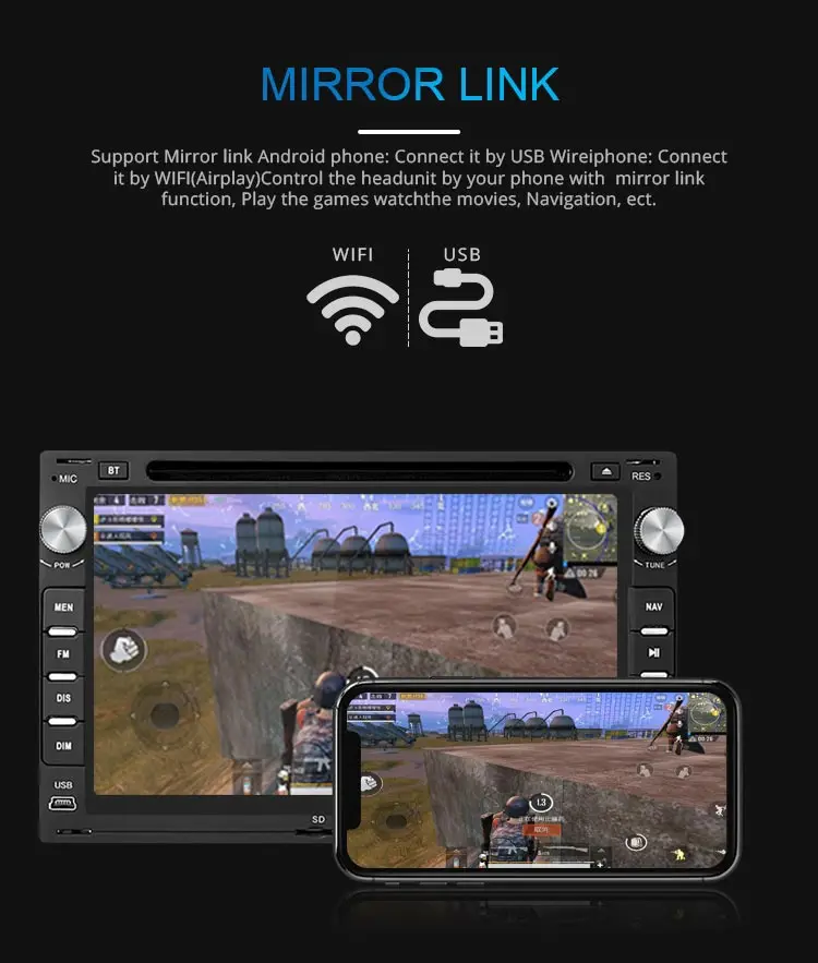 -Встроенное зеркало.Он может подключаться к Iphone через точки доступа Wi-Fi и подключаться к Android мобильный телефон через usb-кабель и точку доступа Wi-Fi. Мобильный телефон будет отображать изображение на DVD, а также музыку, видео, игру. Для мобильного телефона Android сенсорный экран DVD может управлять мобильным телефоном. (Обратите внимание: он может поддерживать часть мобильного телефона Android, не все из них)