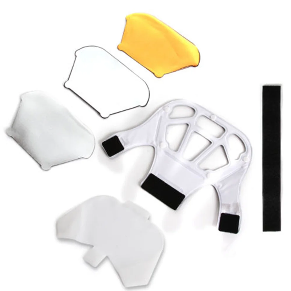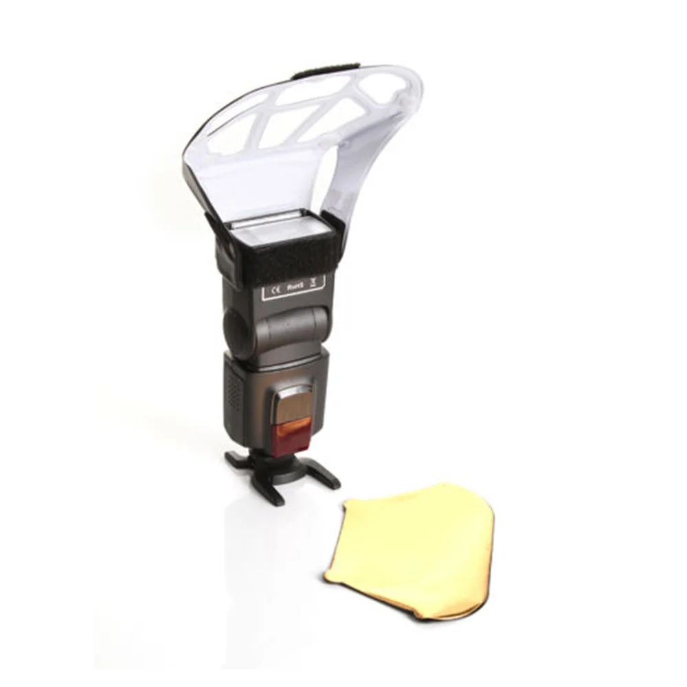 Этот диффузор для вспышки совместим со многими стандартными фотовспышками с регулируемым ремешком на липучке.
