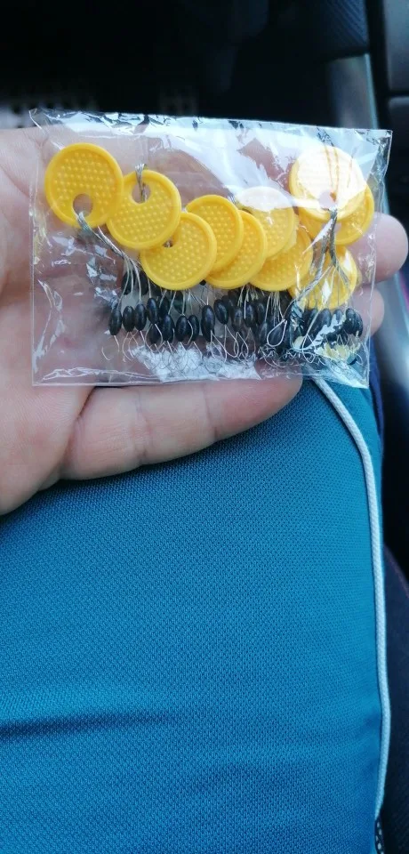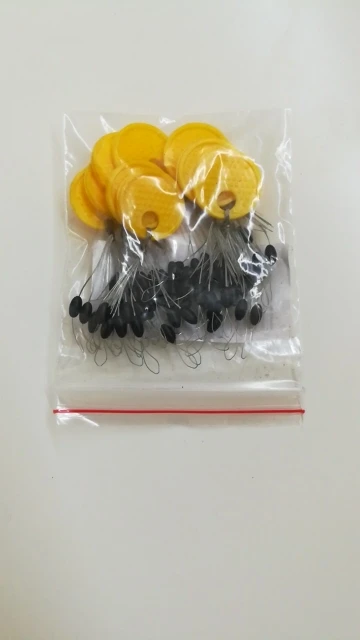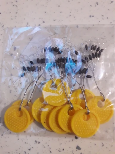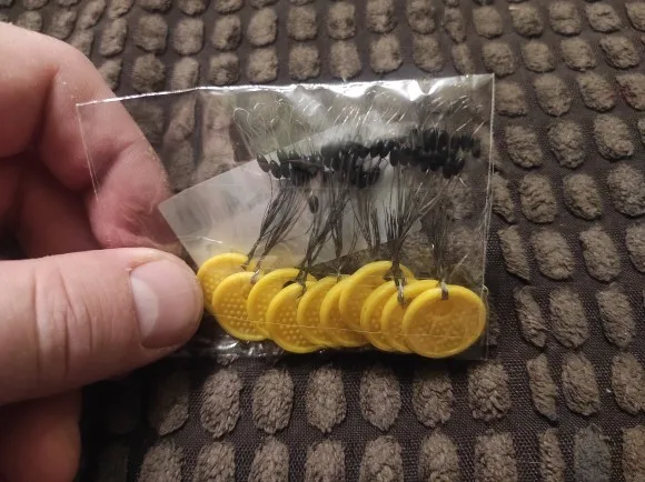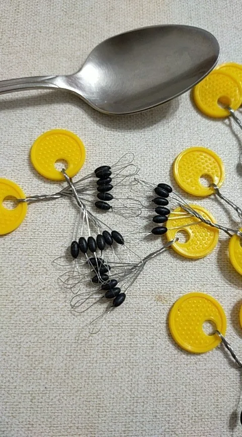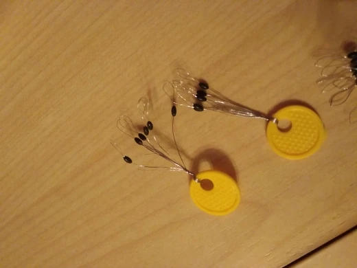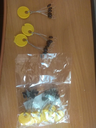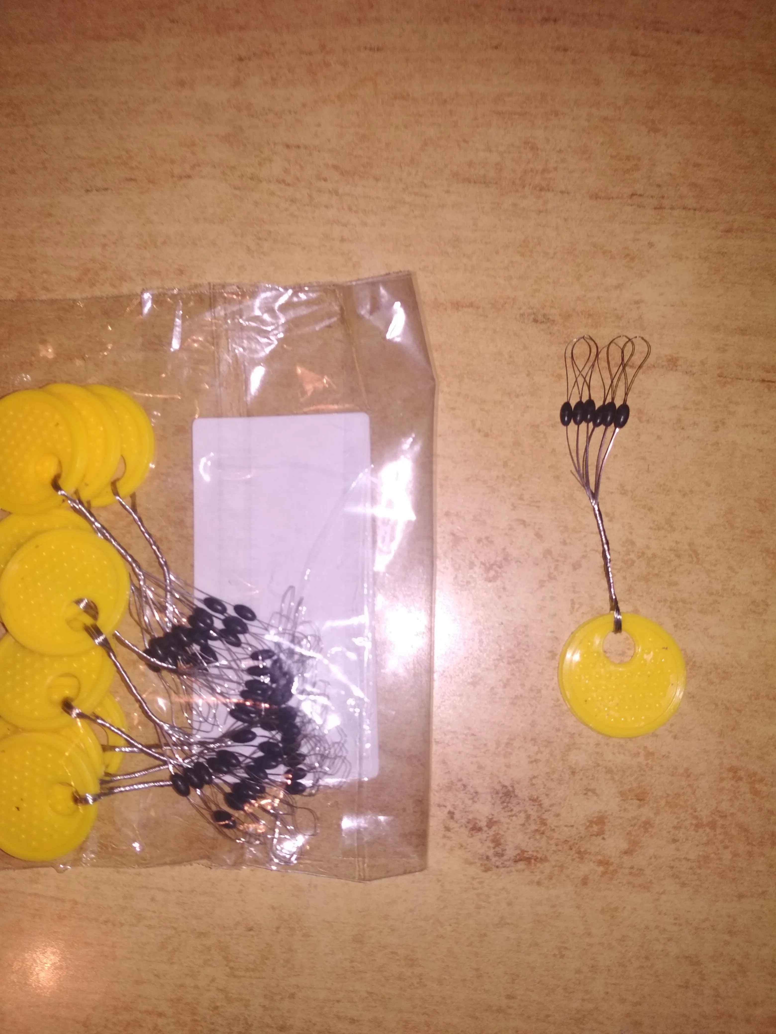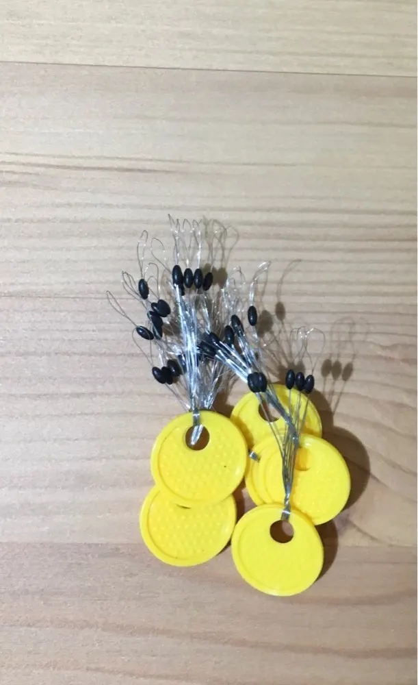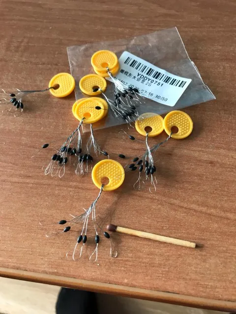Стопорки, как в описании. Очень маленькие, на самую тонкую леску.