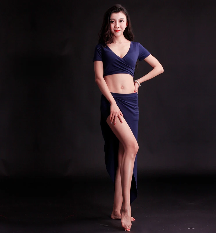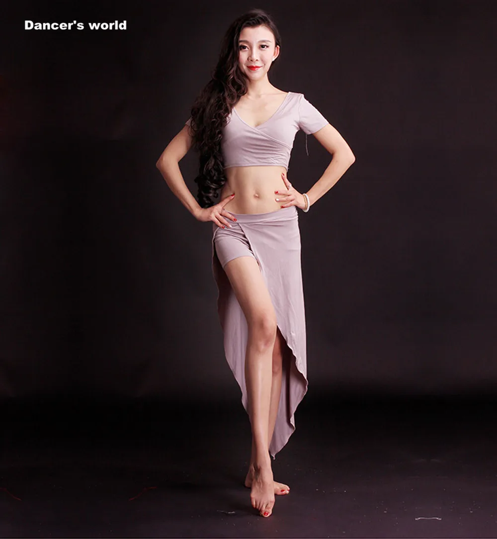 Профессиональная женская одежда для танца живота, модальный топ с v-образным вырезом + короткая юбка, комплект из 2 предметов для танца живота для девочек, костюм для латиноамериканских танцев, юбка с запахом