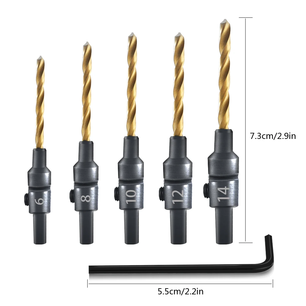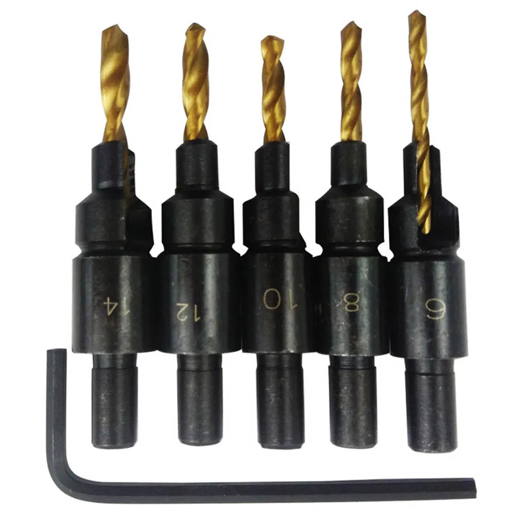 Набор сверл HSS для сверления с зенкером, комплект из 5 насадок с зенкером, направляющее отверстие для винтов размером #6 #8 #10 #12 #14