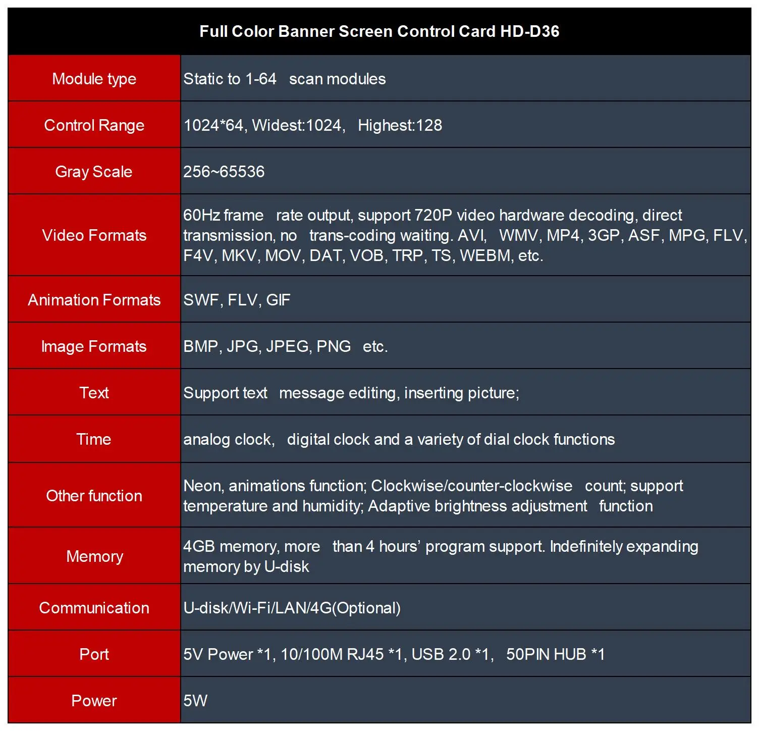 Поставляется с функцией Wi-Fi, беспроводное управление мобильным приложением; Поддержка оттенков серого 256 ~ 65536; Поддержка видео, изображения, анимации, часов, неонового фона; Поддержка слова искусства, анимированный фон, неосветильник вой эффект; Программа Неограниченного расширения U-disk, подключение широковещания; Нет необходимости устанавливать IP, HD-D36 может быть автоматически идентифицирован идентификатором контроллера; Поддержка удаленного управления 4G/Wi-Fi/и сетевым кластером; Поддержка декодирования оборудования видео 720P, выход частоты кадров 60 Гц.