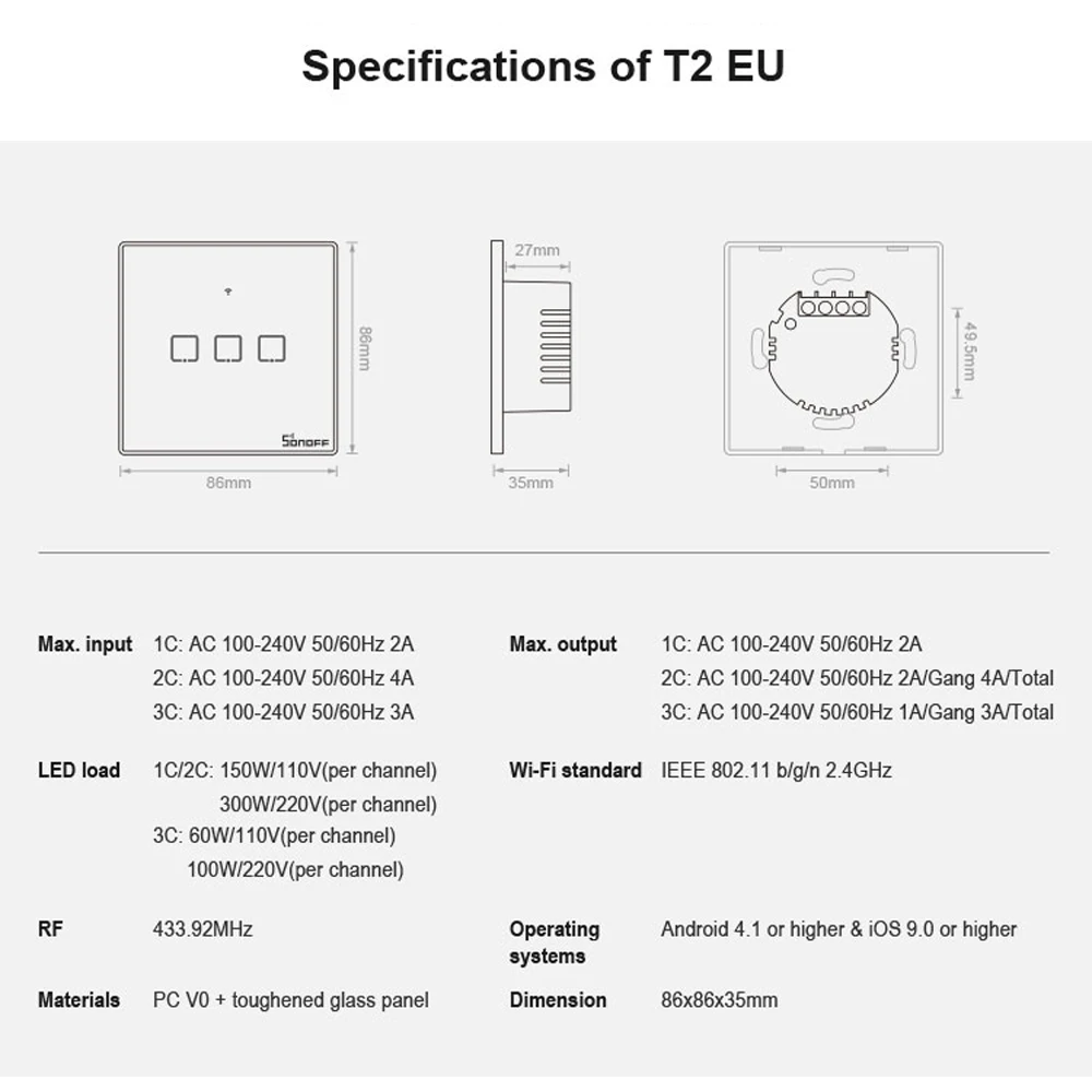 Умный настенный переключатель SONOFF T2EU Wifi можно управлять удаленно с помощью телефона, а устройства, подключенные к переключателям, могут работать независимо. Работает с Amazon Alexa и Google Assistant, который позволяет включать или выключать ваши устройства с голосовой командой, идеально подходит для тех, кто должен обрабатывать много домашней работы одновременно. Небольшой кран для более легкого управления. Установите время для устройств, и переключатели помогут вам включить или выключить их автоматически. Портной смарт-сцена для ваших приборов. Просто установите событие, чтобы вызвать одно устройство SONOFF или группы устройств с помощью нажатия на вашем телефоне. Ваши устройства не будут работать из-за аномальной сети Wi-Fi, управление локальной сети, следовательно, разработано, чтобы убедиться, что они могут нормально работать. Примечание 1: SONOFF T2 ЕС поддерживает пульт дистанционного управления 433 МГц, рекомендуется использовать SONOFF RM433. Примечание 2: SONOFF T2 EU с каймой, не легко повредить.