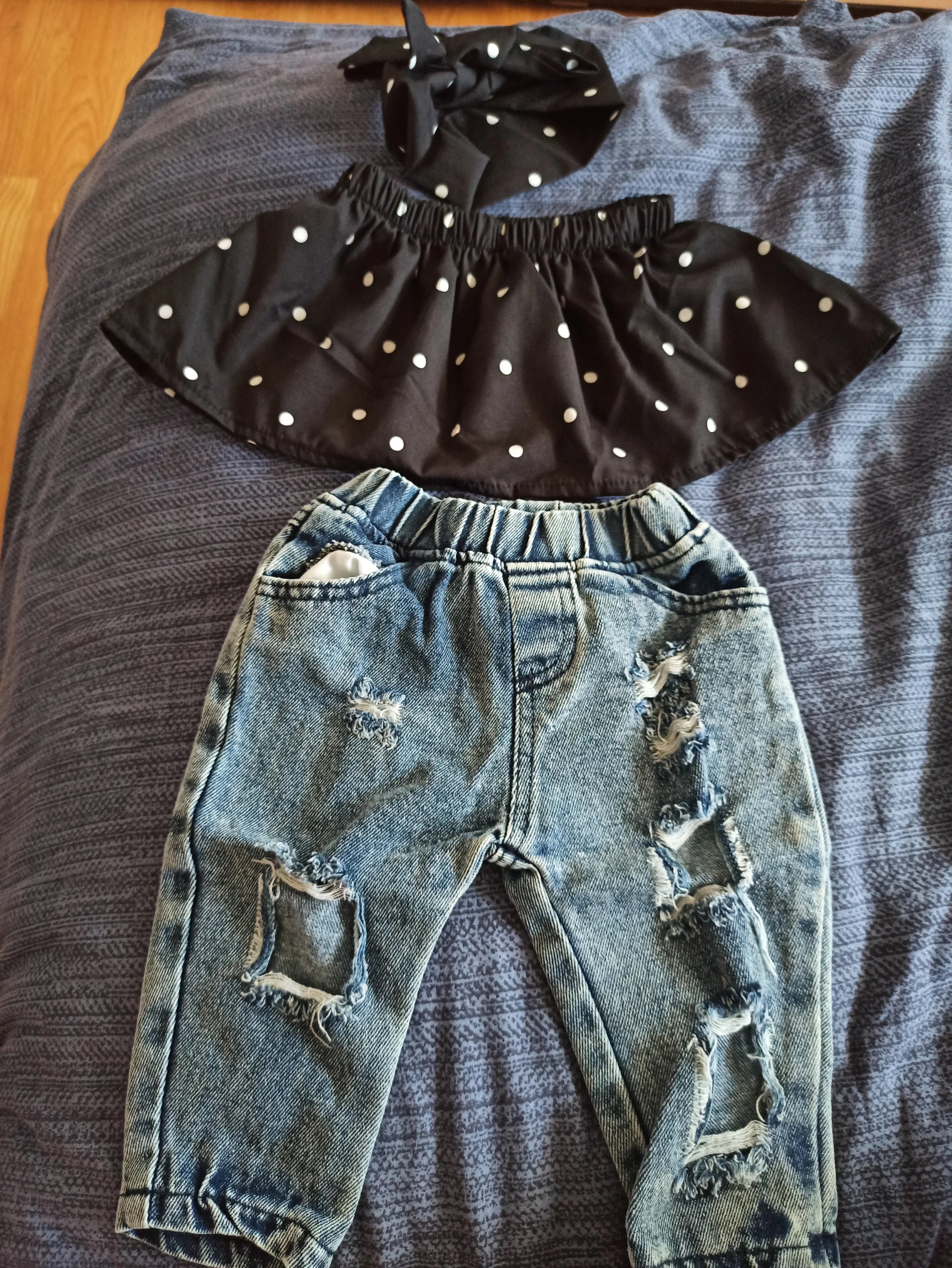 Citgeettджинсы для новорожденных девочек с открытыми плечами в горошек + рваные джинсы; Джинсовый комплект; От 0 до 3 лет