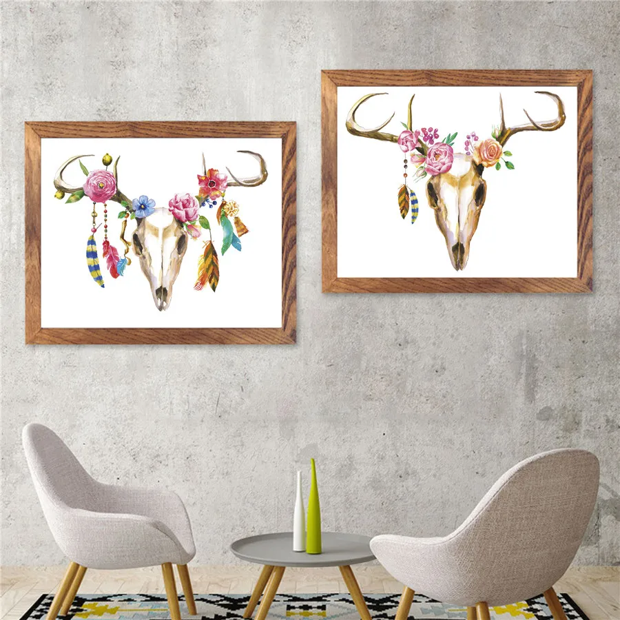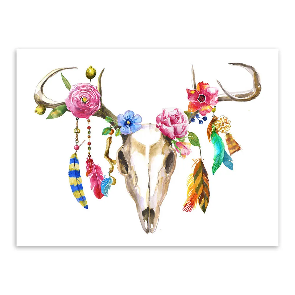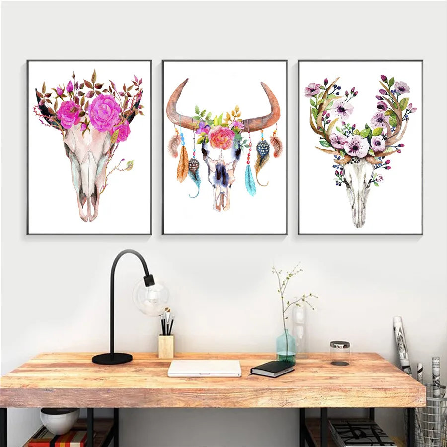 Богемный акварельный олень постер с изображением черепа художественные принты, буйвол бык животные Череп с цветами настенные картины на холсте