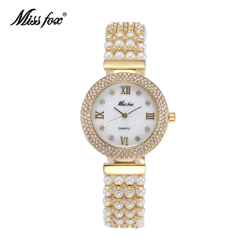 Miss Fox натуральный жемчуг часы женские известный бренд стальная задняя часть водонепроницаемые золотые часы кварцевые часы со стразами женские часы montre femme