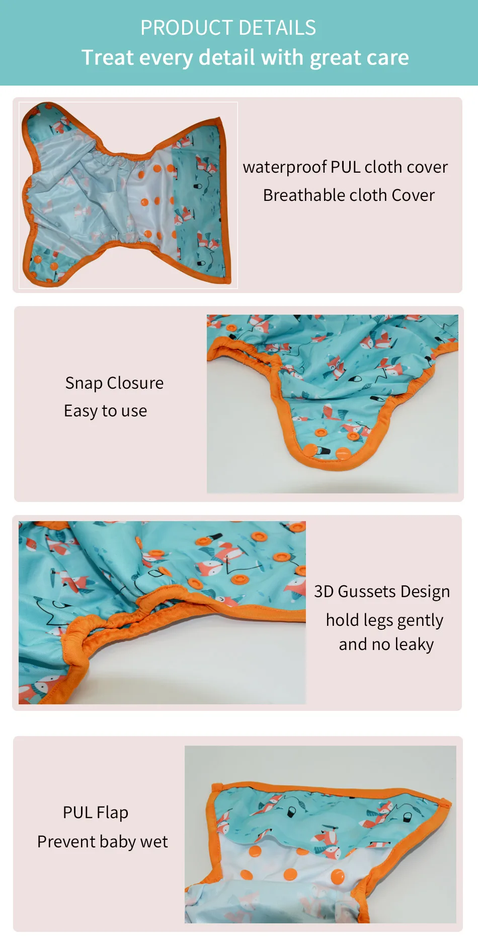 Внешний материал: водонепроницаемый принтРазмер: 3-15 кг ребенкаЗастежка: застежка на кнопкахПодходящая вставка: 3 слоя бамбукового хлопка + 1 слой замшевой ткани