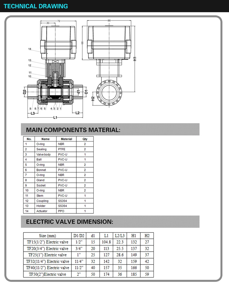 Двухсторонний шаровой клапан с моторизованным двигателем из ПВХ DN40 BSPNPT 1-12 ''347 провода, 10000 нм, электрический шаровой клапан ВКЛВЫКЛ 15 сек, металлическая Шестерня CE