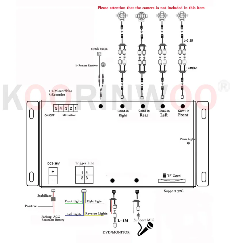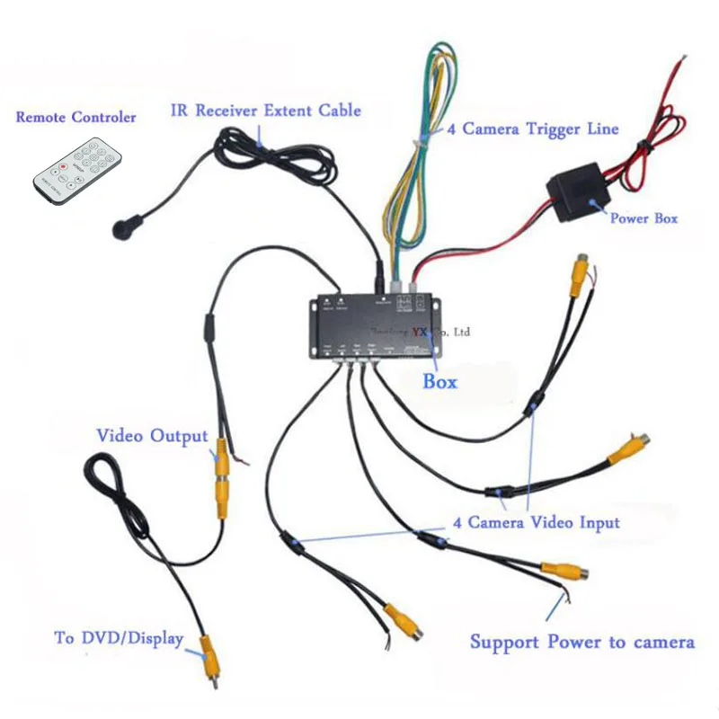 Хост-бокс с использованием технологии высокой интеграции, четыре камеры из основного блока централизованного питания, что значительно снижает установку проводки громоздкой, остальные четыре изображения камеры, собранные хостом после преобразования с помощью видеолинии и подключения порта навигации DVD «AV»