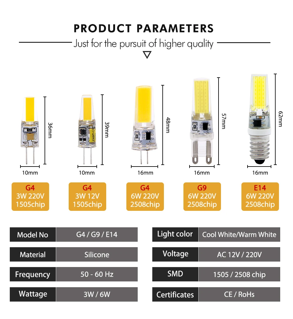 Напряжение:G4: 12 В переменного тока или AC220-240V; G9 : AC220-240V; E14 : AC220-240V