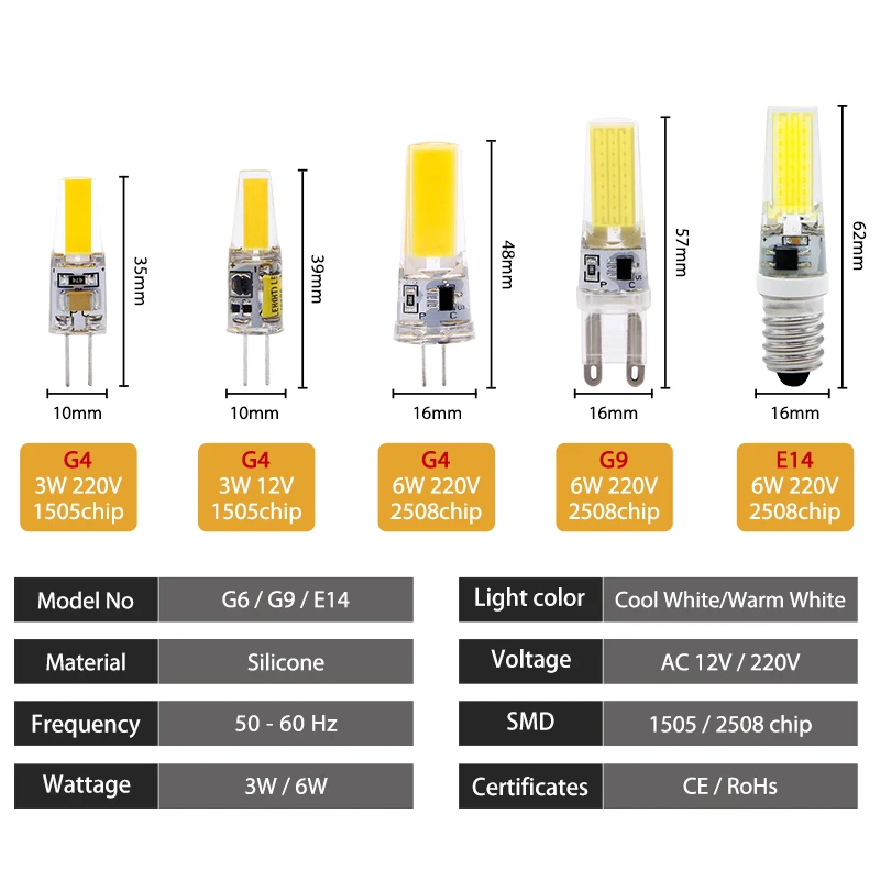10pcslot COB LED G4 G9 E14 3W 6W Light Bulb AC 12V 220V LED Lamp Spotlight Chandelier Lighting Replace 30W 60W Halogen Lamps