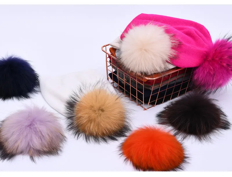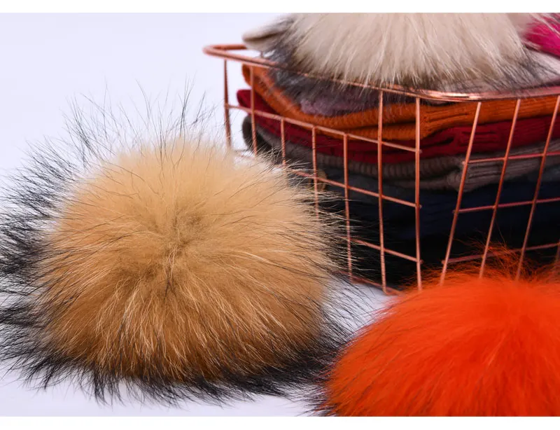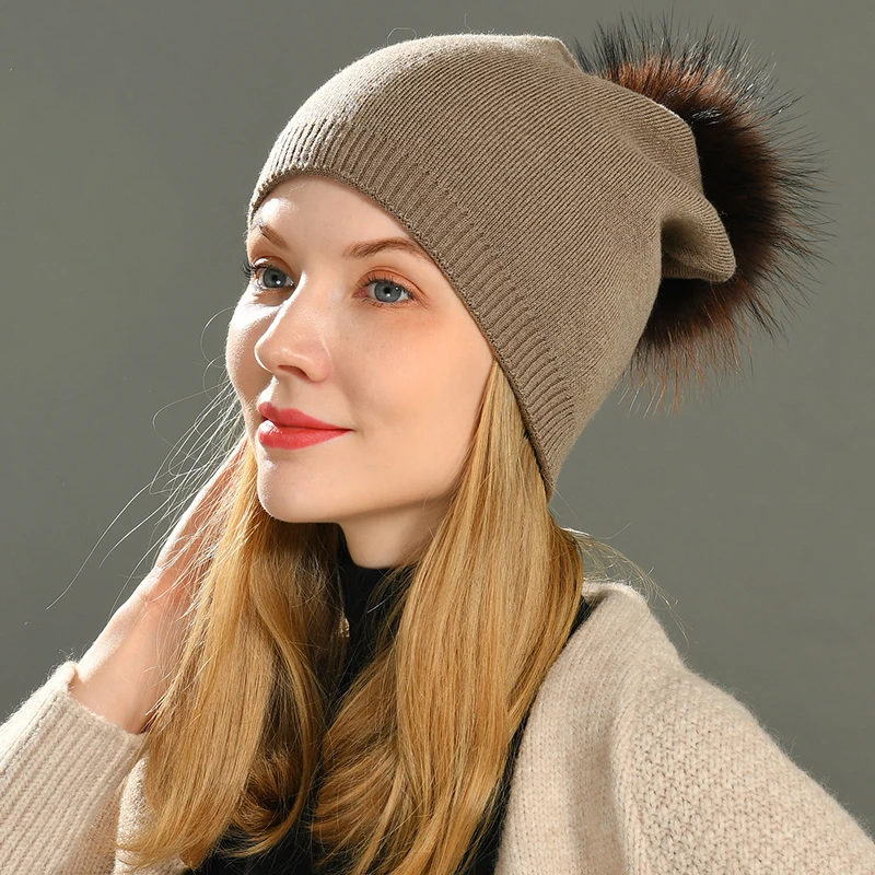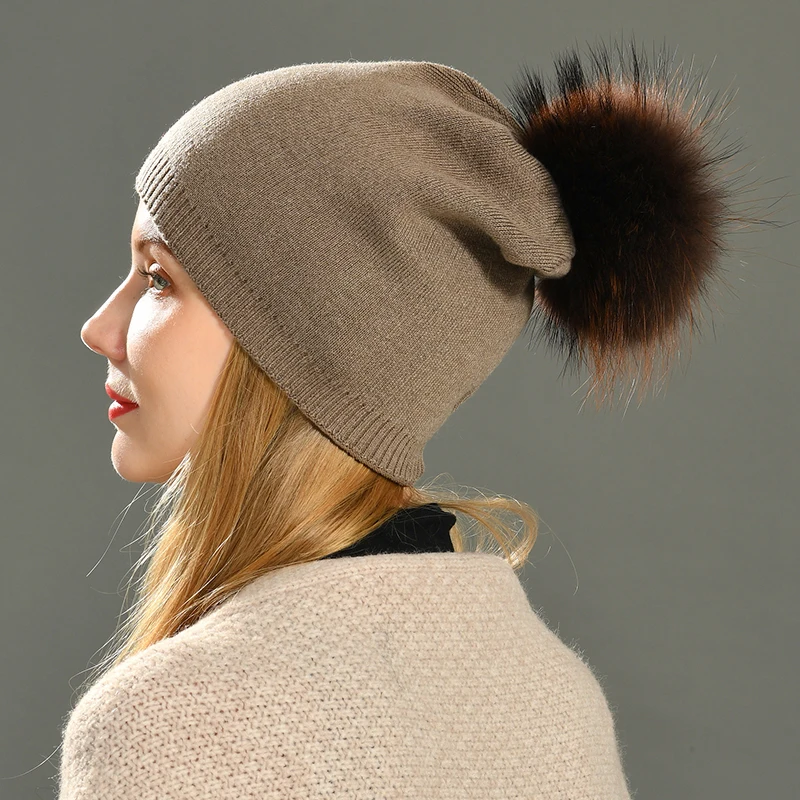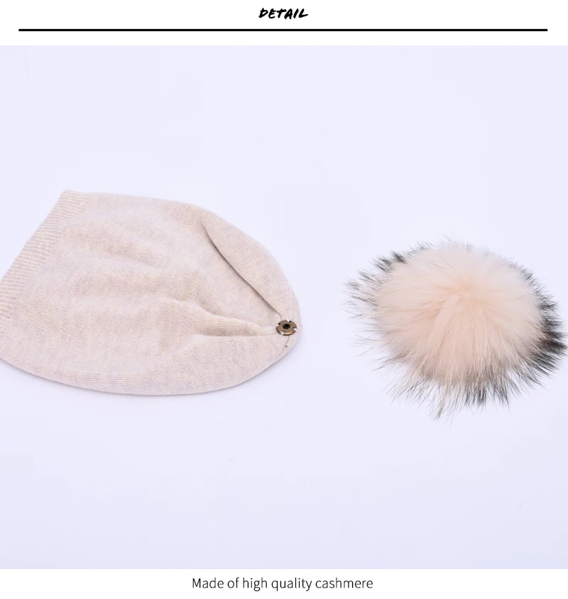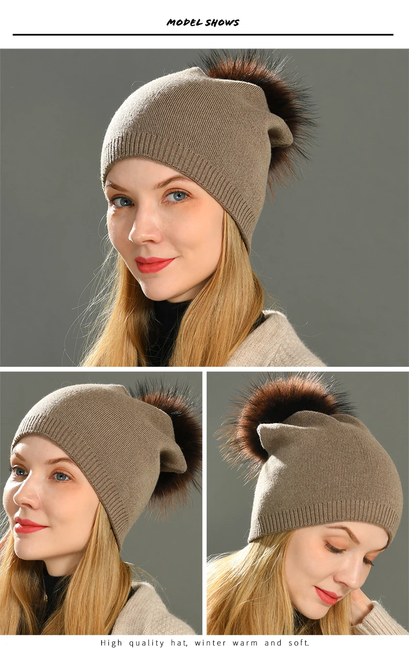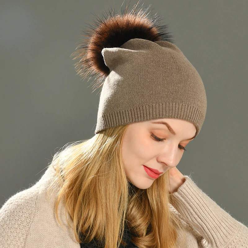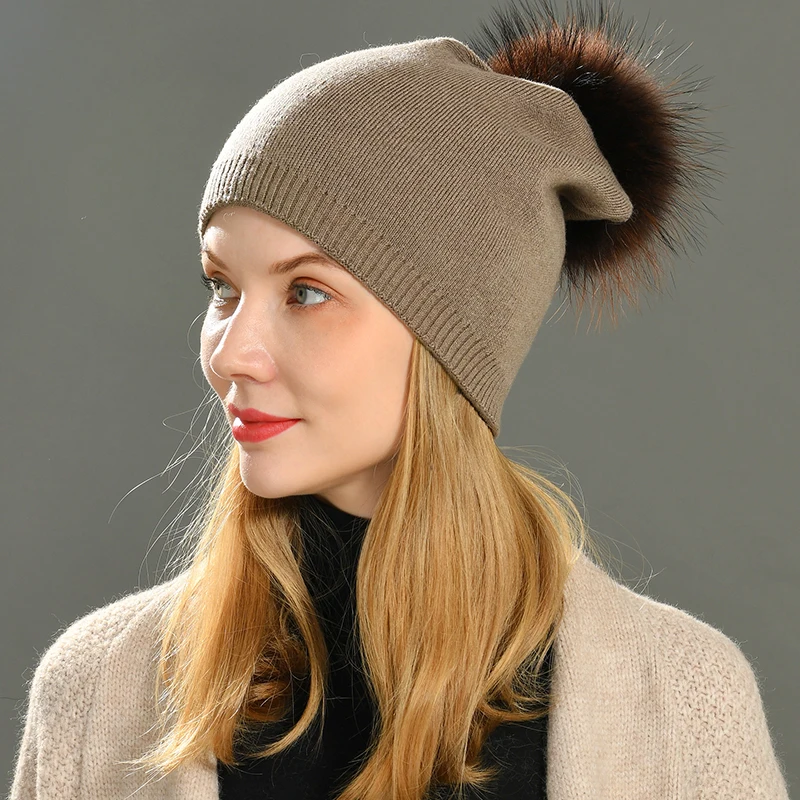 Оптовая продажа, вязаная шапка с помпоном из натурального меха енота, женские шапки, кашемировая зимняя шапка, Женская хлопковая шапка Skullies, шерстяная шапочка