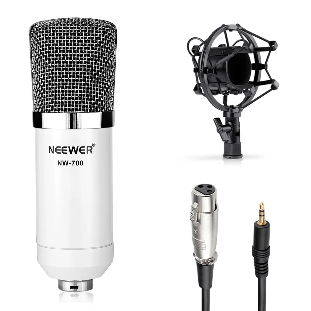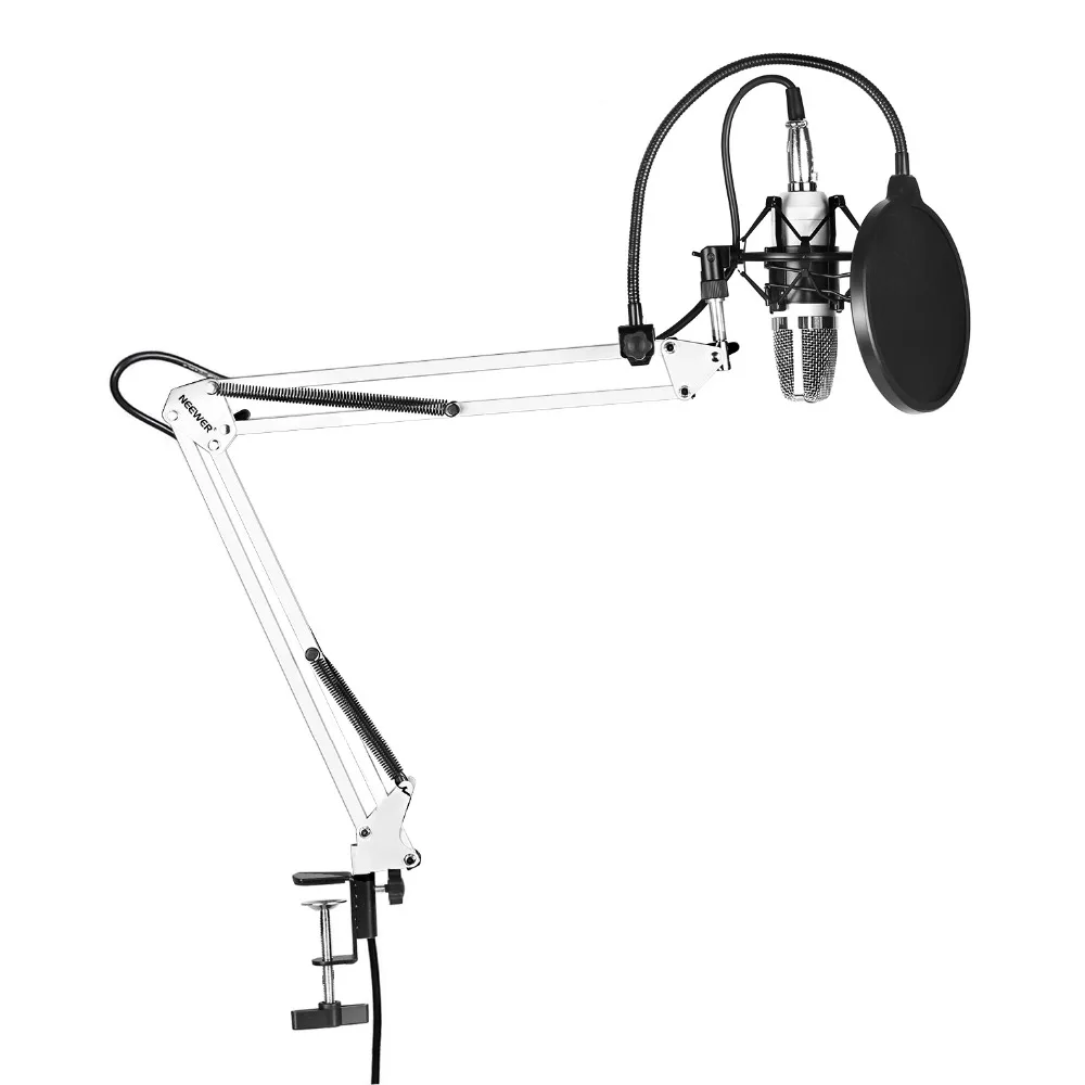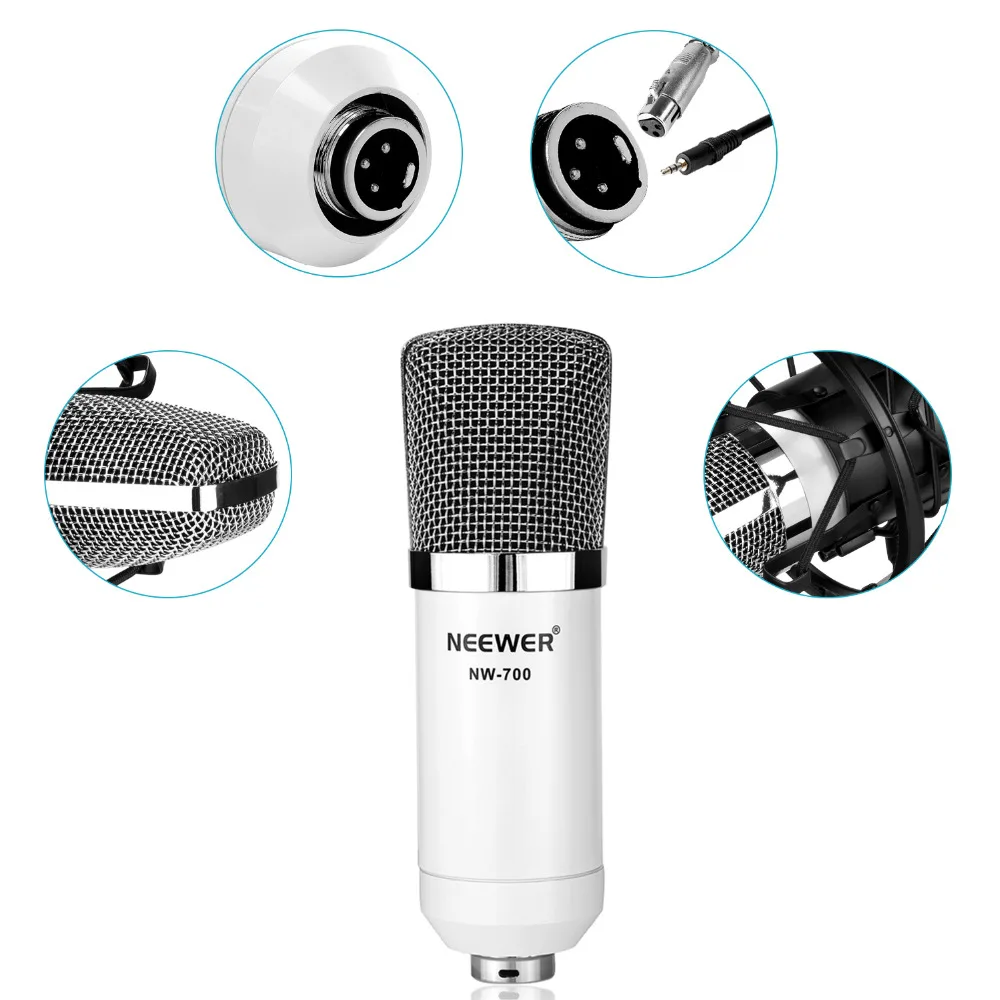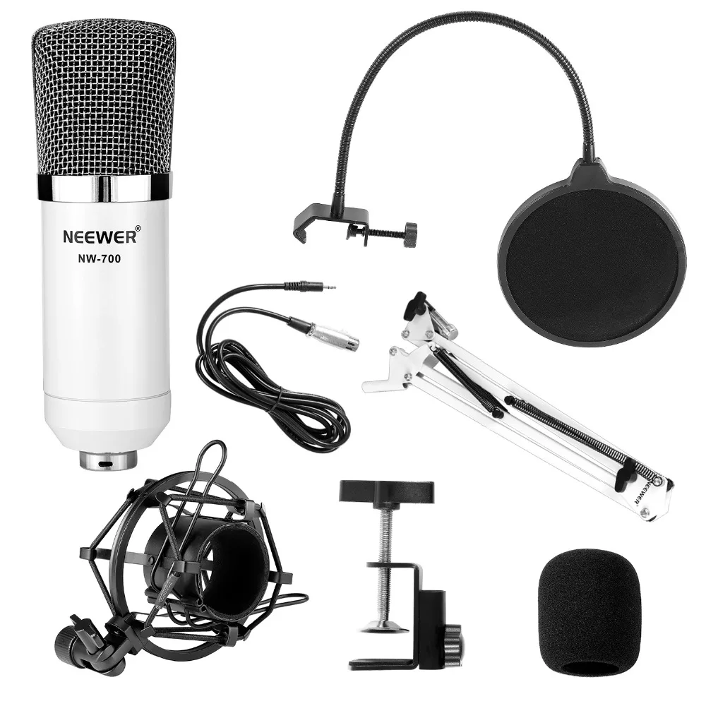 Набор микрофонов Neewer NW-700, включает в себя:(1) конденсаторный микрофон + (1) подвесная ножничная подставка для микрофона с монтажным зажимом + (1) поп-фильтр + (1) ударное крепление (белый)