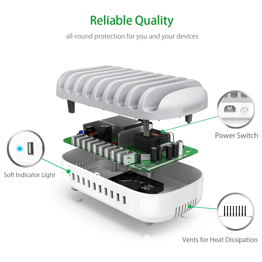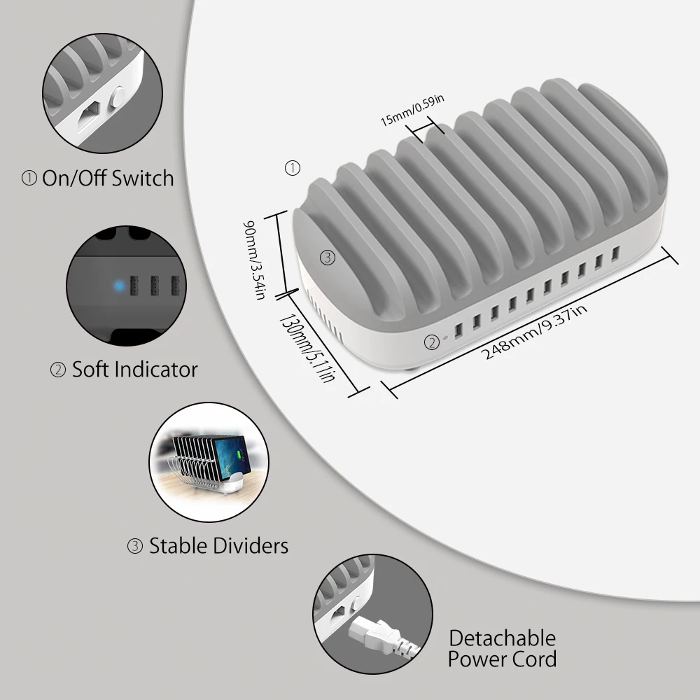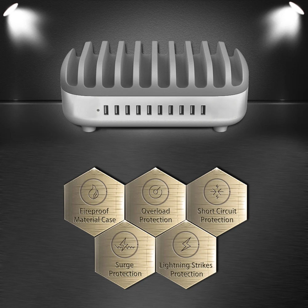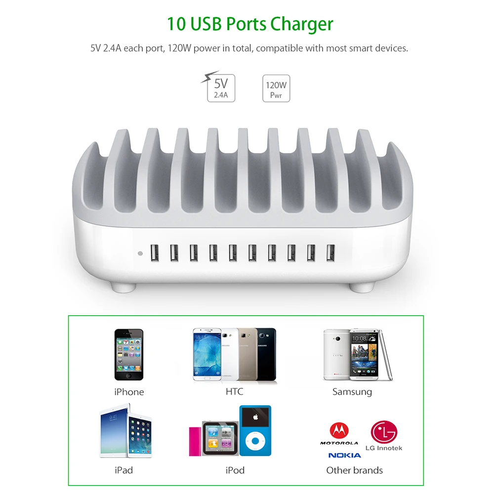 Инновации с высокой энергией, концентрированная зарядка 10 устройств любитель 10 портов USB зарядное устройство, 140 общая мощность, каждый порт 5V2.4A полный выход, зарядка 10 планшетов сразу, удобно для использования в ресторанте, отеле, школа, торговый центр, аэропорт и т. Д.