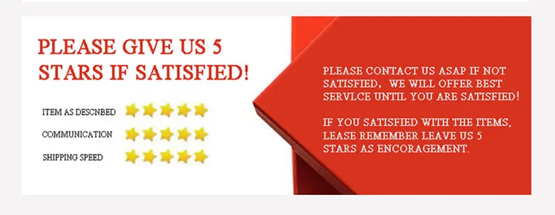 L. Если вы удовлетворены нашими продуктами и услугами, пожалуйста, оставьте 5 звезд отзывы, мы будем очень благодарны (Описание проекта 5 звезд, связь 5 звезд, время перевозки 5 звезд) 2. Если продукт, который вы получили, поврежден или стиль неправильный, пожалуйста, не оставляйте отрицательные отзывы, пожалуйста, свяжитесь с нами, мы разберемся и найдем лучшее решение, ваше удовлетворение-это наша мотивация к лучшему.