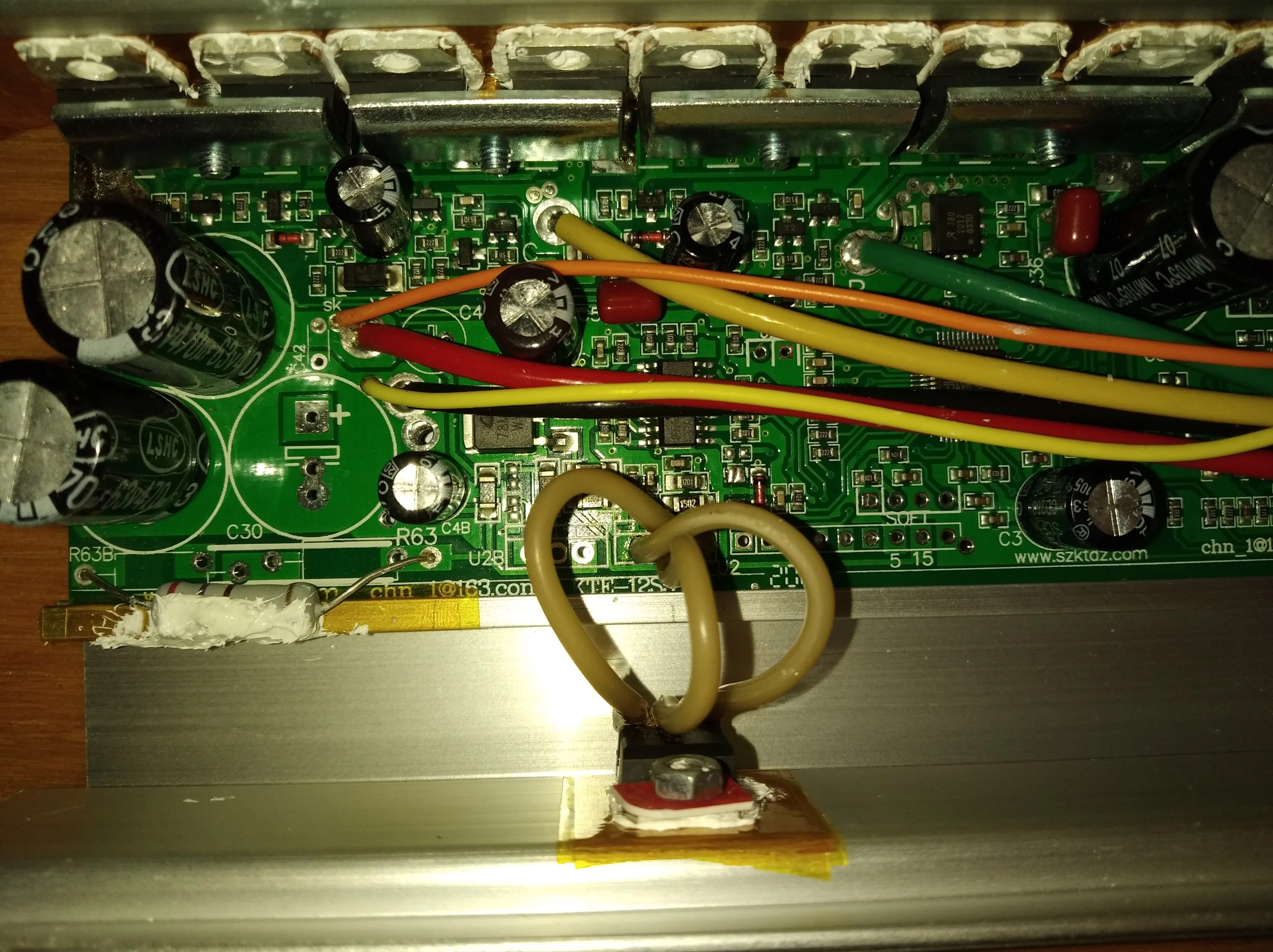 Рабочий, проверил дома, покататься с ним не получается, зима ведь, провод датчика скорости присутствует. Разобрал, нанес термопасту на мосфеты, заменил провод питания на более толстый, для успокоения) LMку перенес на корпус через изоляционную, теплопроводящую прокладку, сильно греется если оставить как есть, кому интересно, всё на фотках. Настанет тепло, покатаюсь, дополню. Надеюсь что все будет ок)