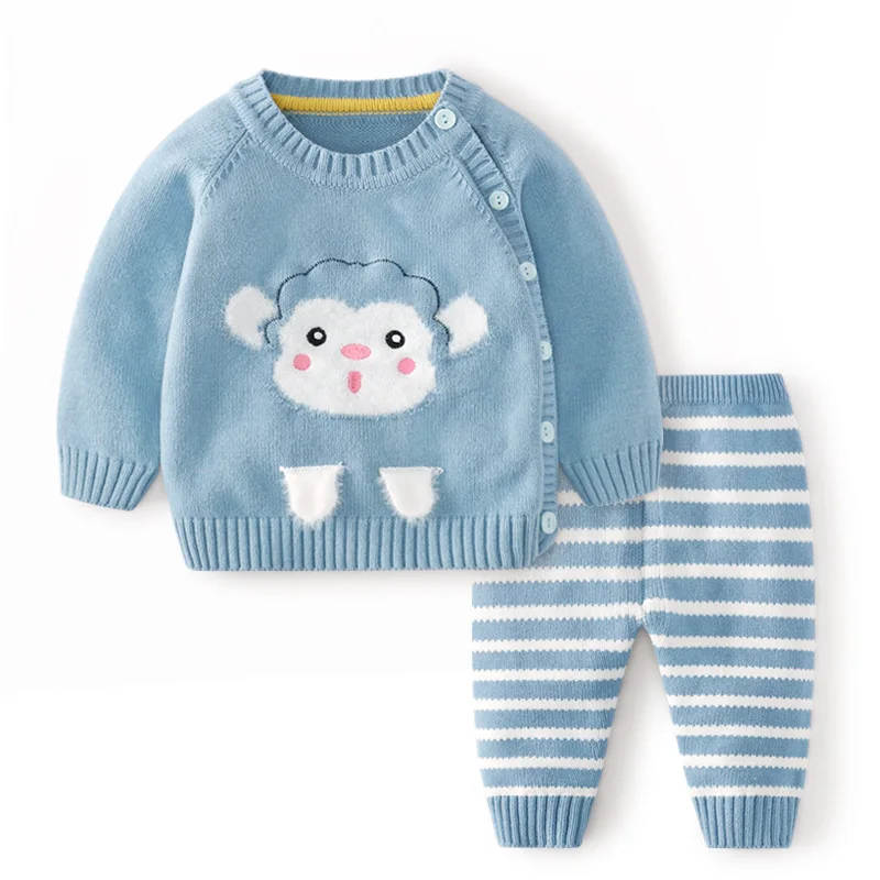 Подробнее о продукте: Название продукта: Baby свитер набор Материал: 100%-й хлопок • Цвета: небесно-голубой, розовый, фиолетовый, сливовый • Рукава: длинный рукав Дизайн свитер: баранина Комплект поставки: 1 набор (1 свитер и 1 пара длинные брюки)