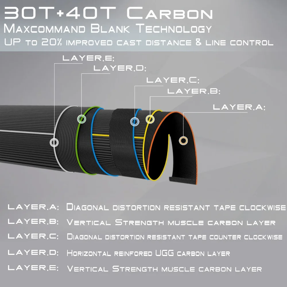 Эксклюзивный MAXCOMMAND свободная технология-Чистый 30T смешанный 40T углеродное волокно. С смешанными 7 слоями углерода, включая усиленный углеродный слой мышц для по крайней мере 25% увеличенной производительности литья. 11ft переключатель стержень идеально подходит для небольшой форели и мелкий бас. И шпея прут отлично подходит для Кохо/озерной форели/коричневой форели и стали.