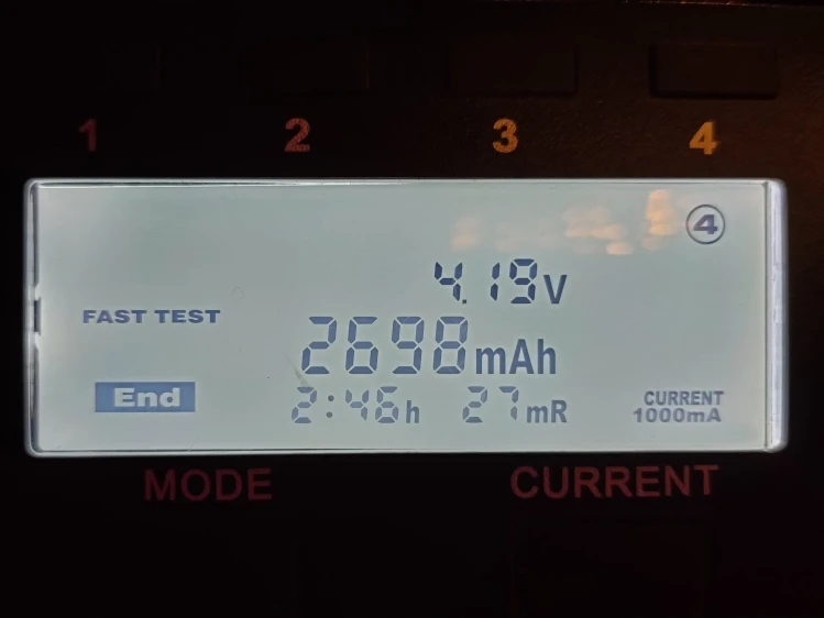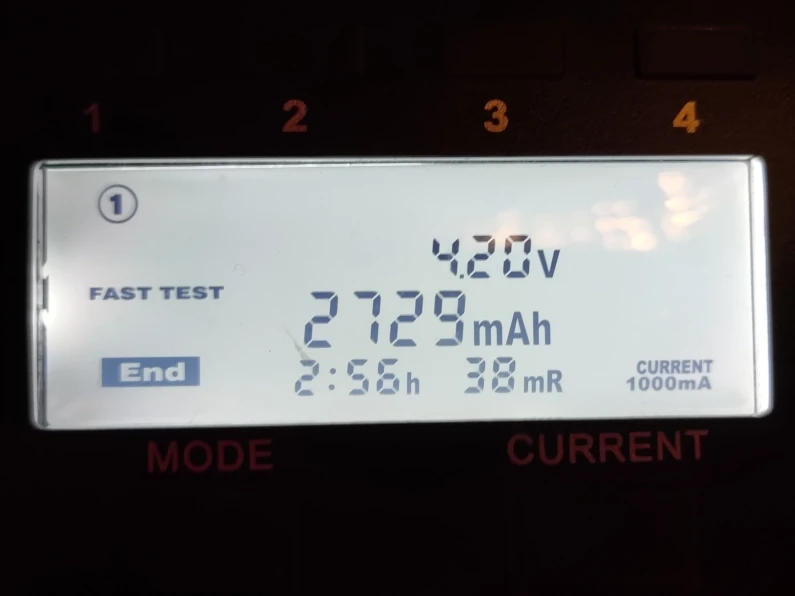 Ёмкость приличная за эту цену, теряет заряд за пол года - год интенсивного использования и становится 2000 где-то, на фото полных 3 цикла заряда-разряда и текущая ёмкость новых батареек.