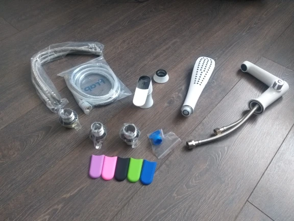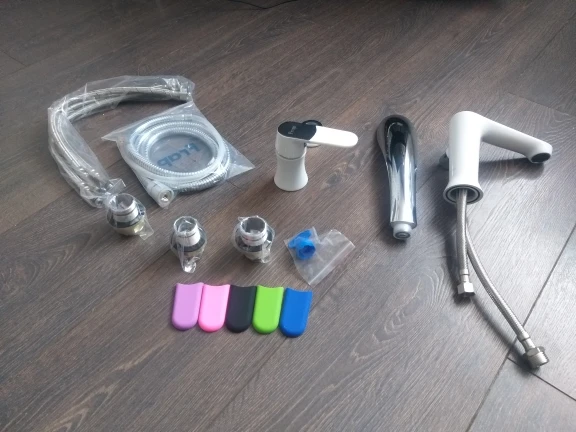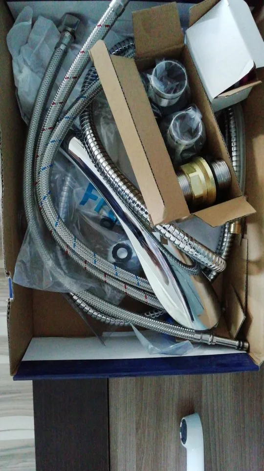 Смеситель описанию соответствует. Хорошо упакован. Внешний вид внушает доверие, беленький, блестящий. Коробка тяжелая, да и сам смеситель и кран тяжелые, не силумин. В наборе имеются армированные шланги. По мне так лишняя опция, для моей ванны по длине не подойдут.
