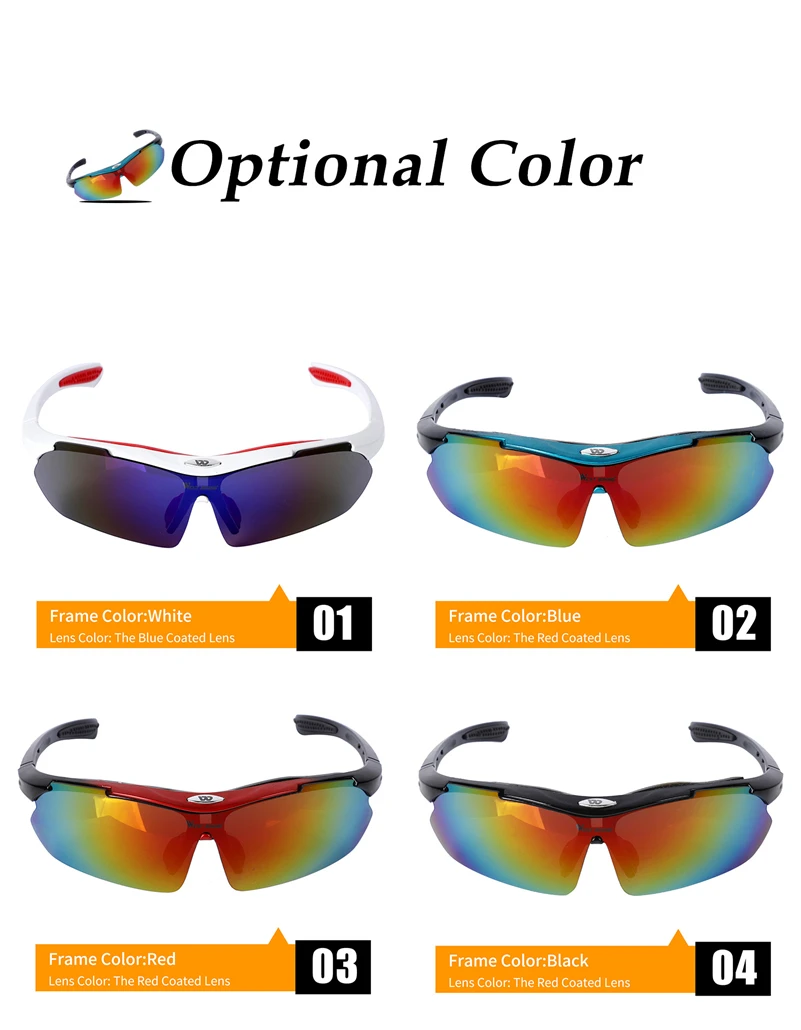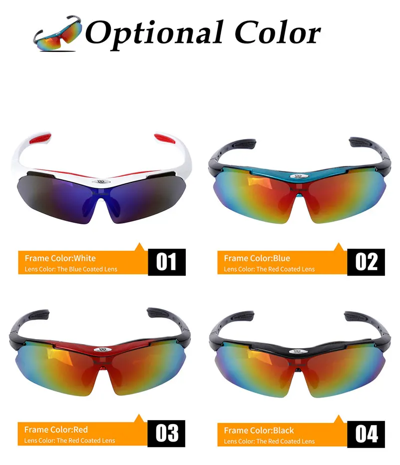 1. Велосипедные очки с многослойным покрытием высокой плотности.2. Ветрозащитные и пылезащитные велосипедные очки.3. Прочная оправа и регулируемые носовые упоры.Упаковка: 4 Сменные линзы Тестовая карта, ткань для очков, оправа mypia, веревка для очков, коробка для очков.Очки имеют пять оправ, вы должны выбрать одну из них. И каждый очки с пятью линзами. Купить пару очков эквивалентно покупке пяти пар очков, линзы могут быть изменены в зависимости от различных погодных условий.Функция 5 линз1. Противотуманные линзы синего цвета (подходят для противотуманной погоды)2. Желтые Светящиеся ночные линзы (костюм для ночного велоспорта)3. Прозрачные ослепительные линзы в дождливые дни (костюм для ночного велоспорта)4. Черные поляризованные солнечные линзы (подходят для солнечных дней, они нужны водителю Фишеру)5. Красочные ослепительные цветные hd-линзы (улучшают контрастность и резкость, лучший выбор для водителя)