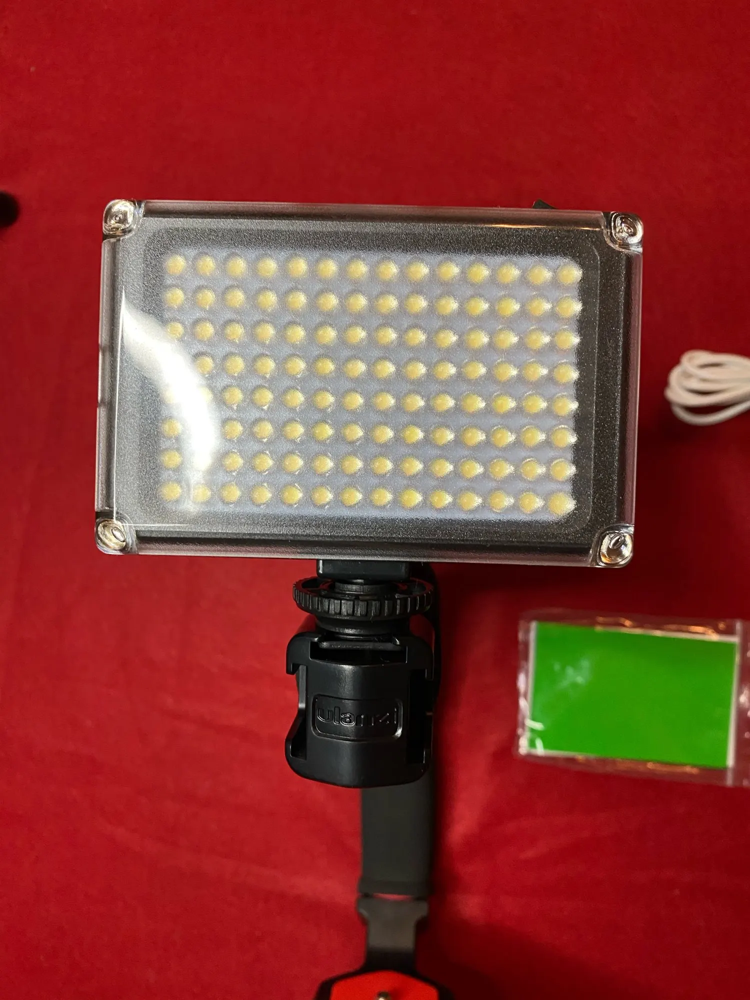лампы соответствуют описанию, для питания нужны батарейки или от кабеля (у меня в комплект не входили). есть несколько цветных фильтров, белая бумага между этими фильтрами может быть использована как рассеиватель. есть регулировка яркости, но с очень маленьким диапазоном колеса. есть стандартное крепление к штативам.