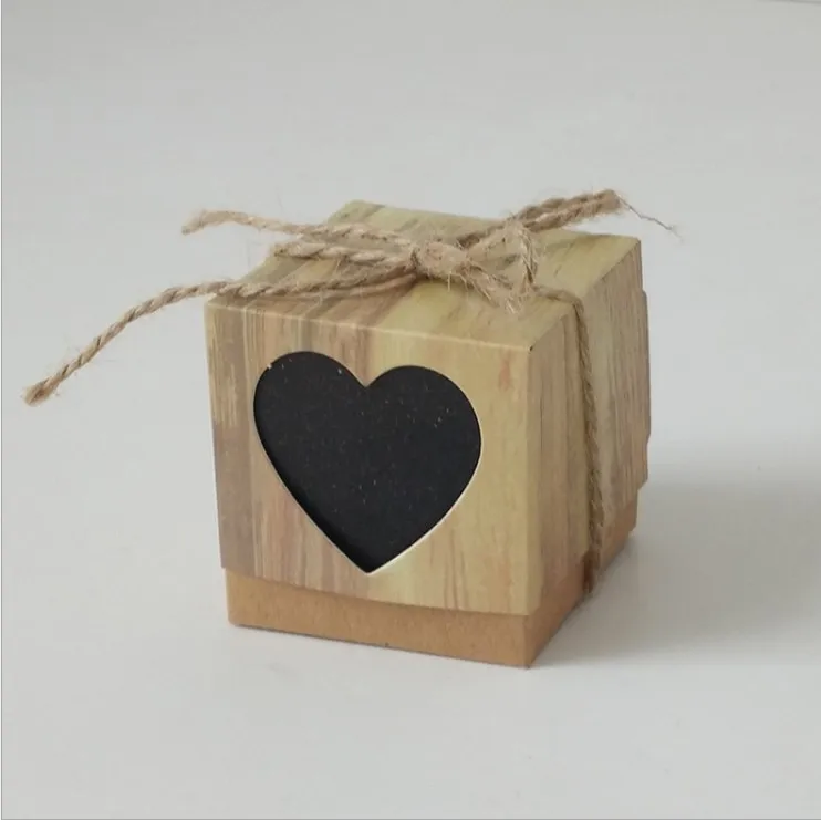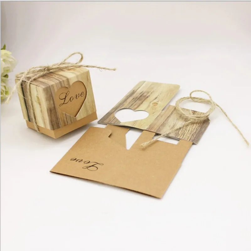 100 комплектов, свадебная бонбоньерка с сердечками, рустикальная крафт-корка, коробка для конфет с мешковиной, шикарная винтажная Подарочная коробка для свадебных торжеств