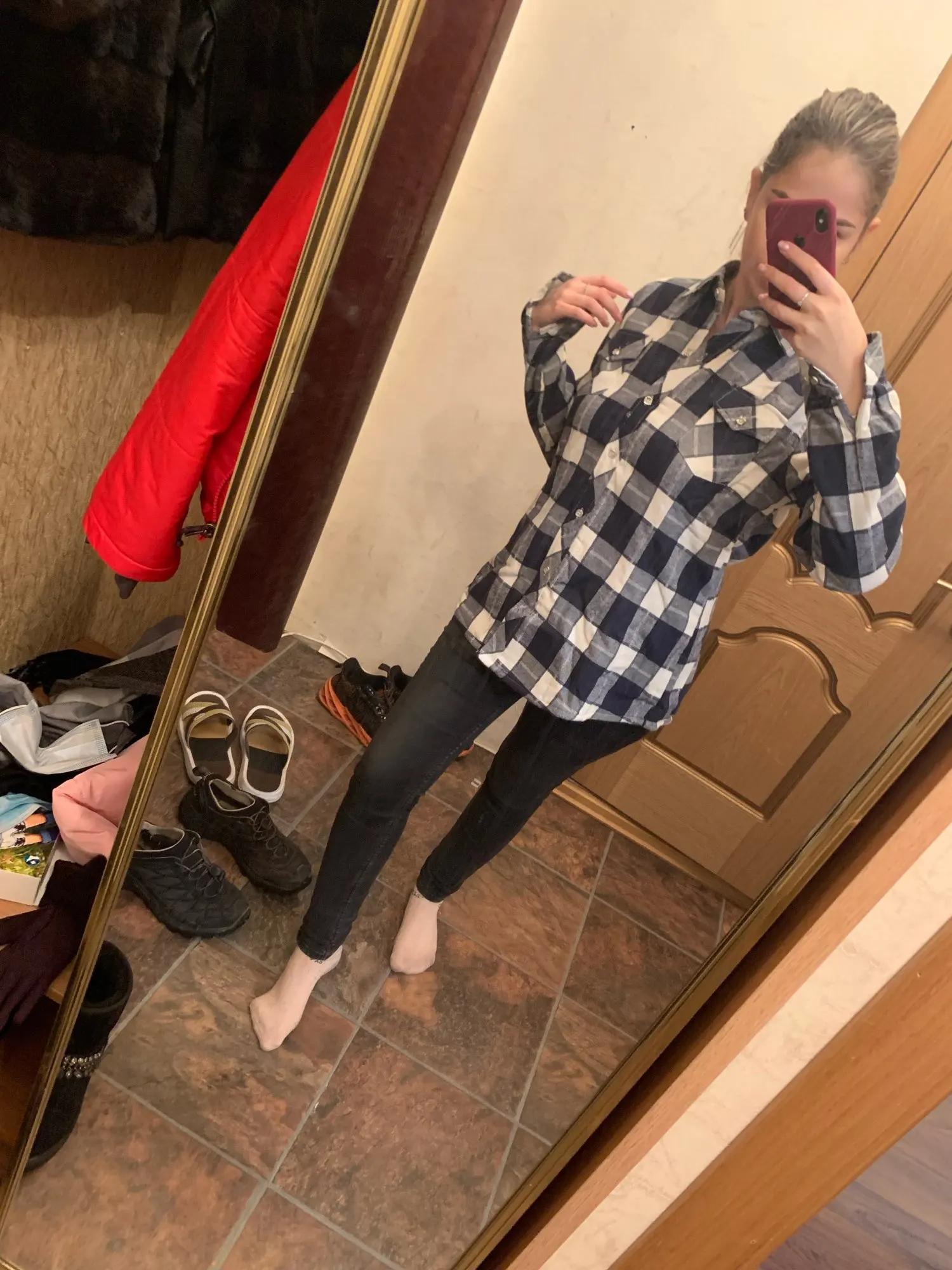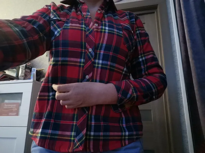 Доставка очень быстрая,трек отслеживается .Рубашка тёплая,очень приятная к телу.,но сильно маломерки.Мой рост 172,о.г. 97.Я взяла 4хL и сидит хорошо ,свободно,как и должна быть тёплая рубашка.На первых двух фото рубашка одета на джемпер.,на случай холодов.