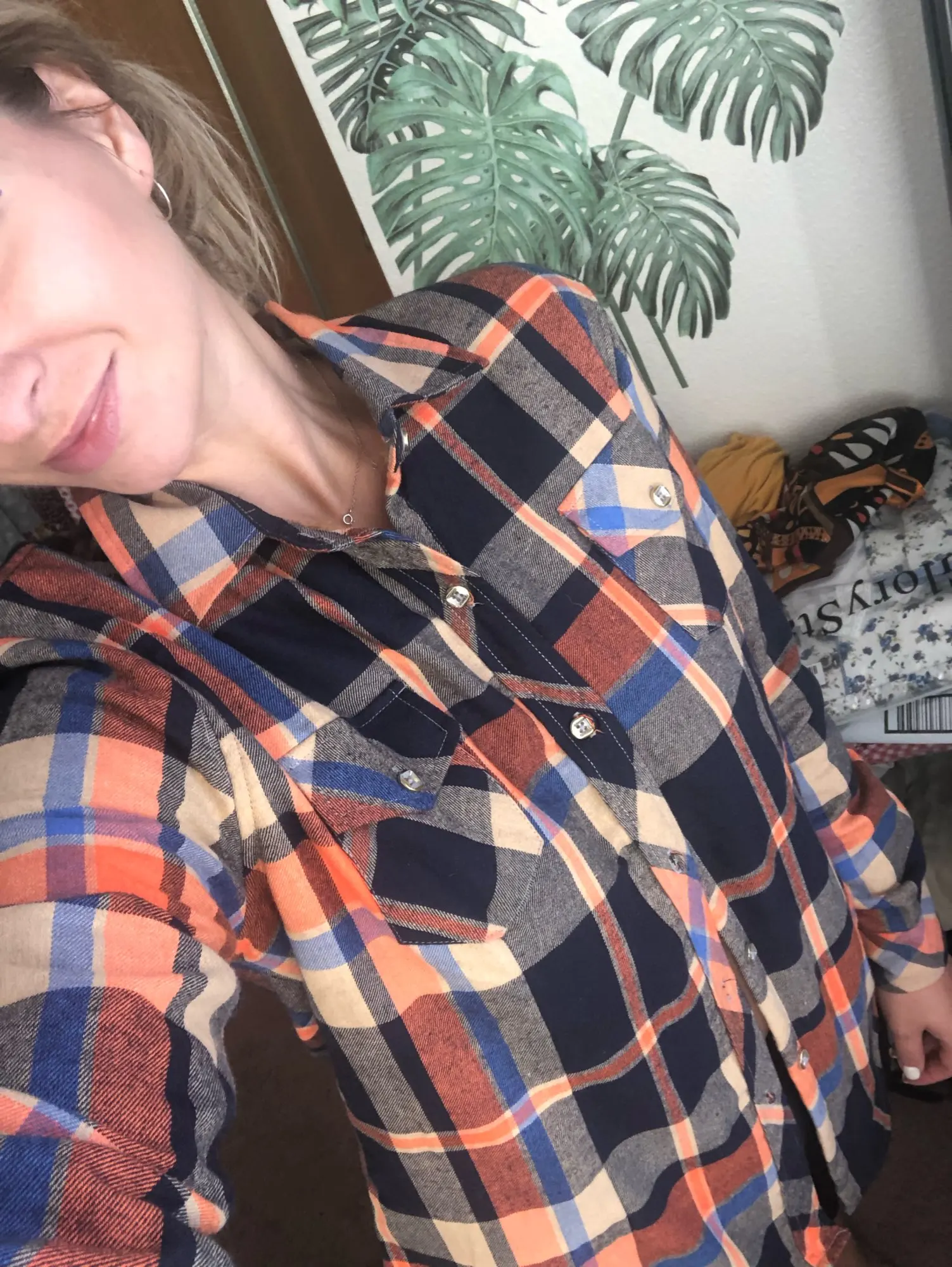 быстрая доставка, качественная рубашка, аккуратные строчки, кое-где нитки, но это не критично. постороннего запаха нет. на вид выглядит достаточно стильно. покупкой довольна.