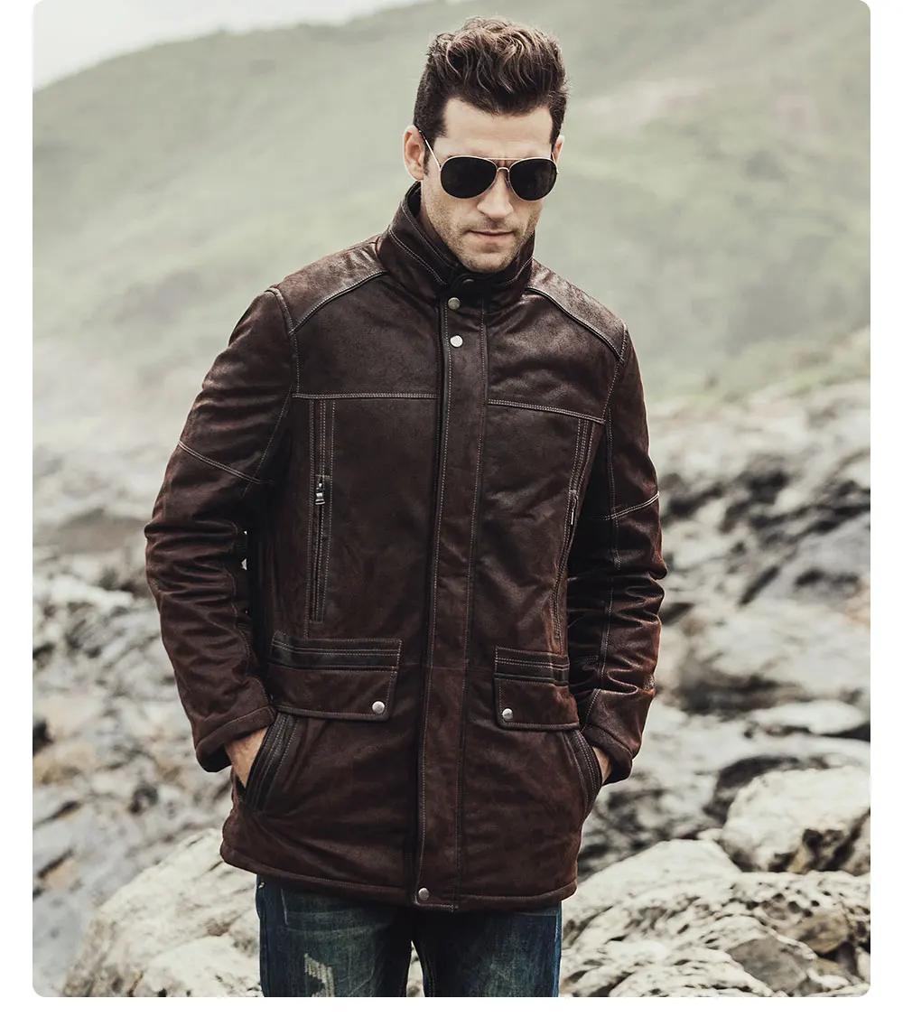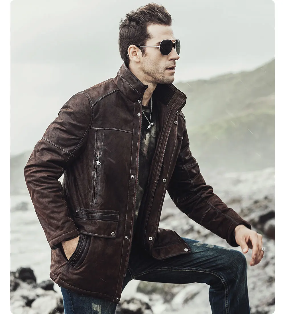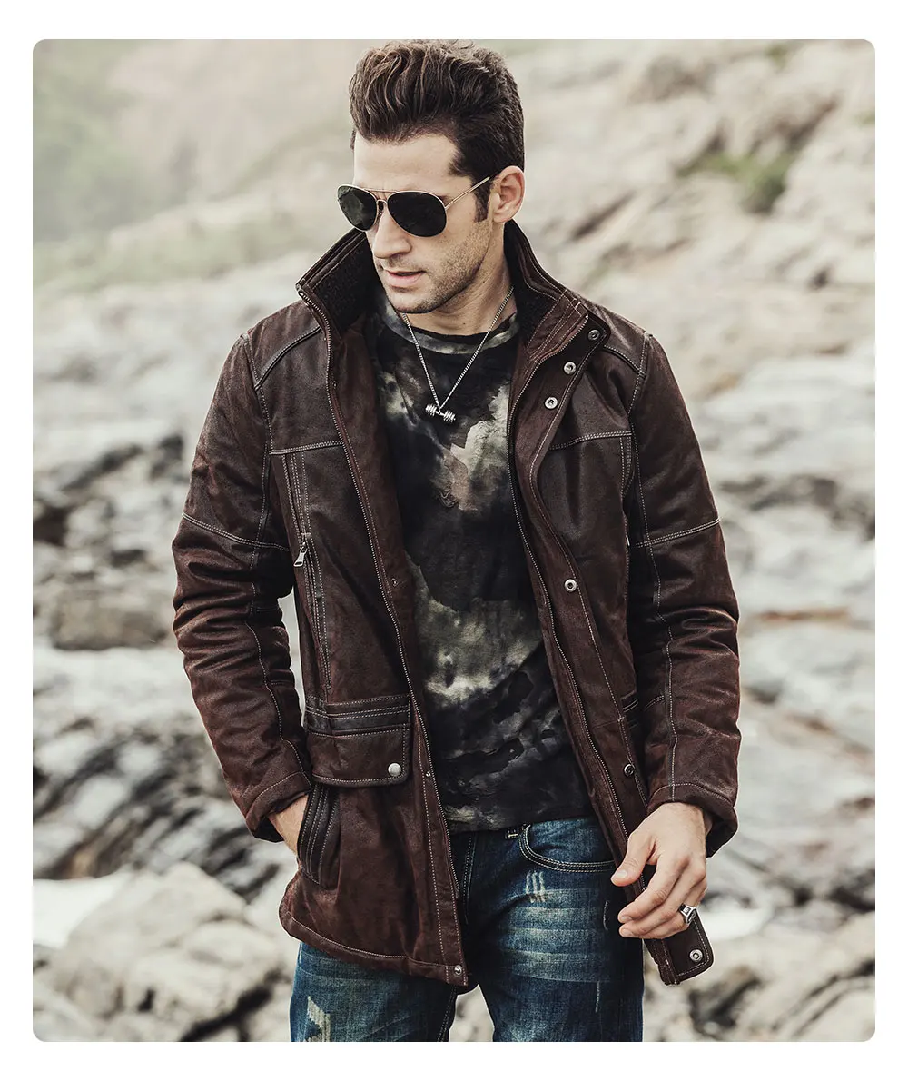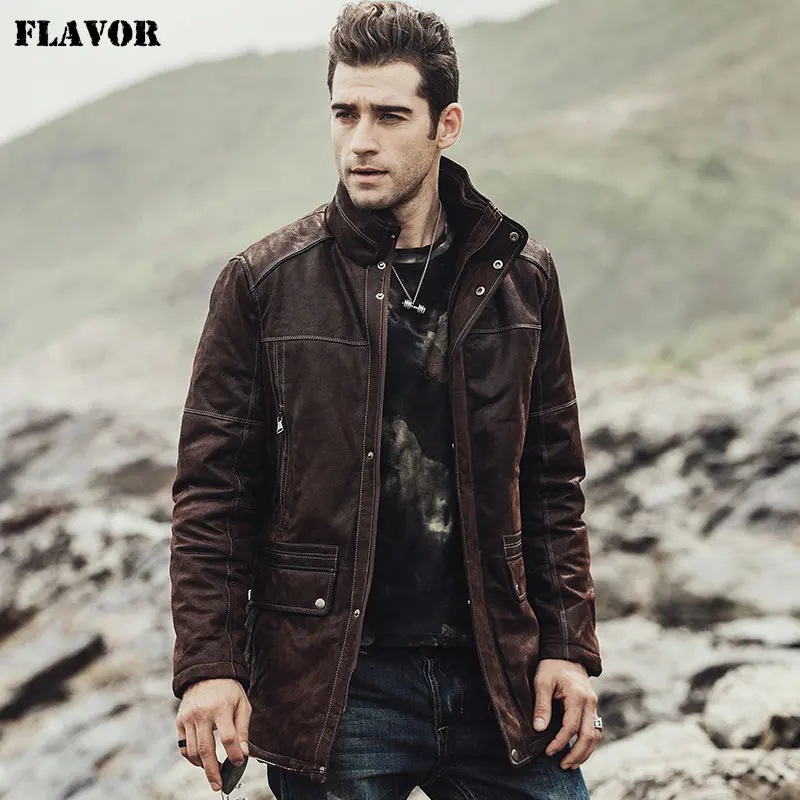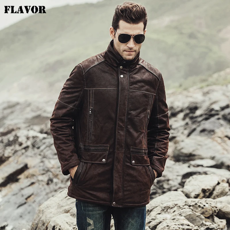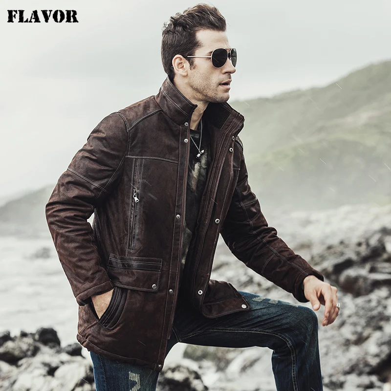 Kожаная куртка мужская FLAVOR, коричневая куртка из натуральной свиной кожи, теплое мужское пальто на хлопковой подкладке, новинка для зимы