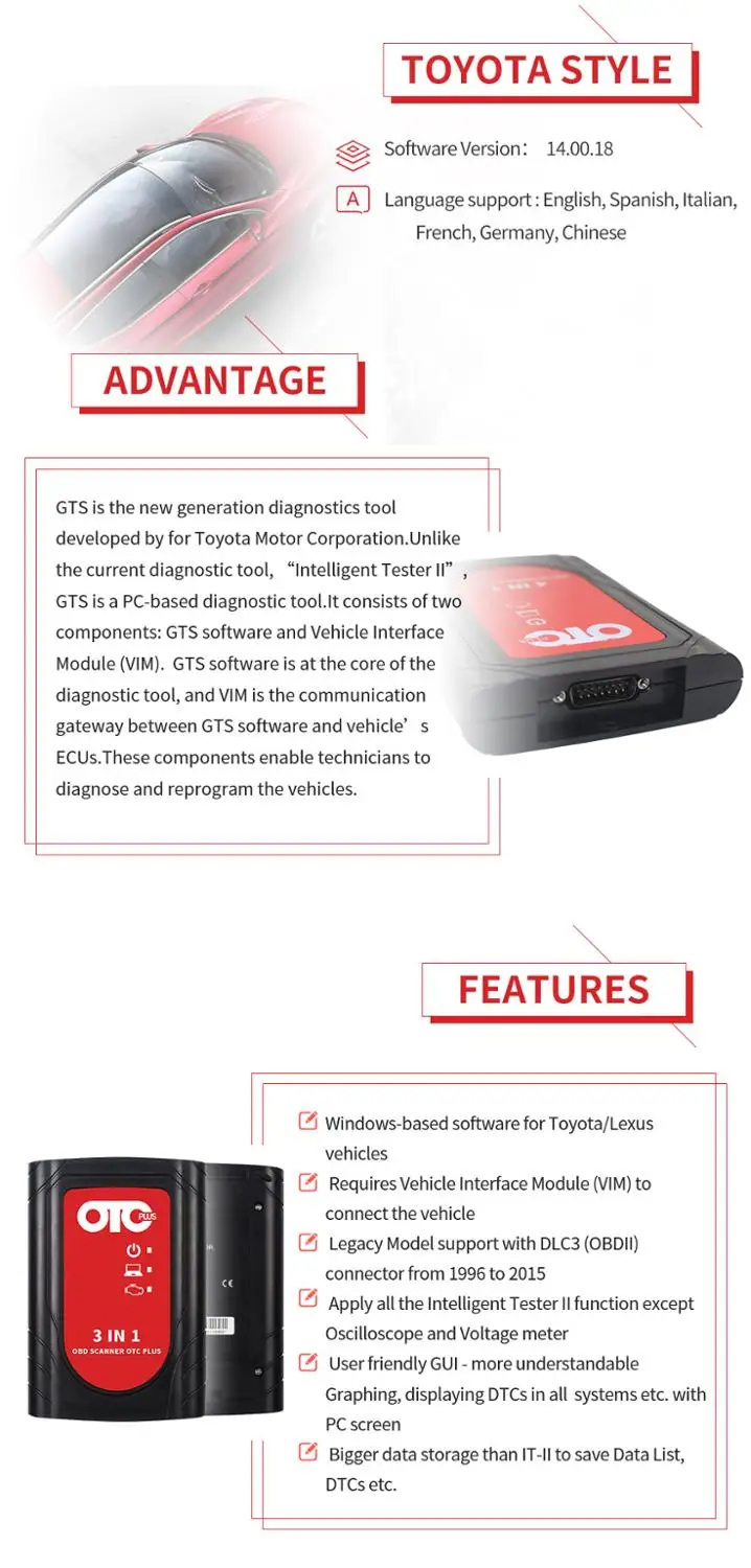 GTS-это диагностический инструмент нового поколения, разработанный для Toyota Motor coration.В отличие от современного диагностического инструмента, «интеллектуальный тестер II», GTS является диагностическим инструментом на основе ПК.Он состоит из двух компонентов: программного обеспечения GTS и модуля интерфейса транспортного средства (VIM).Программное обеспечение GTS находится в основе диагностического инструмента, и VIM является шлюзом связи между программным обеспечением GTS и ECUs транспортного средства.Эти компоненты позволяют техникам диагностировать и перепрограммировать транспортные средства.Поддержка языков: английский, испанский, итальянский, французский, немецкий, китайскийОсобенности• Программное обеспечение на базе Windows для автомобилей Toyota/Lexus• Требуется интерфейсный модуль транспортного средства (VIM) для подключения транспортного средства• Поддержка старой модели с разъемом DLC3 (OBDII) от 1996 до 2015• Используйте все функции интеллектуального тестера II, кроме осциллографа и счетчика напряжения• Пользовательский GUI-более понятный графический интерфейс, отображение DTCs во всех системах и т. д. с экраном ПК• Больше хранения данных, чем IT-II для сохранения списка данных, DTCs и т. Д.В комплект входит:1: 1 Основной блок2: 1X OBD2 основной Cabe3: 1 кабель VIM4: 1X компакт-диска