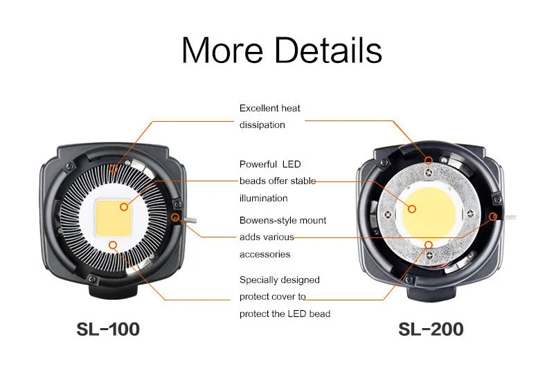 Godox SL-200W видео Светильник обеспечивает высокую светильник яркость и индекс цветопередачи с Мощный светодиодный бусины, она создает стабильное светильник ресурсов и равномерное освещение для видеосъемки, фотожурналистской и свадебной съемки и т. д. Особенности -Светодиодный светильник 200 Вт гарантирует высокую яркость и стабильное освещение. -Индекс цветопередачи составляет более 93, R9-более 80, достоверно представляя объекты. -С беспроводным пультом дистанционного управления для регулировки яркости светильник, беспроводная система группирования 433 МГц (6 групп и 16 каналов) -ЖК-панель большого размера для точной и легкой работы. Настройки автоматически сохраняются. -С функцией контроля температуры для предотвращения перегрева. -Со специальным защитным чехлом для эффективной защиты светодиодный бисер. -С высококачественным радиатором и встроенным охлаждающим вентилятором, чтобы обеспечить Превосходное тепловыделение. -Небольшой размер, легкий и портативный. -С креплением в стиле Bowens, чтобы добавить различные аксессуары, такие как софтбокс, snoot и т. д. Модель: Godox SL200W AC Питание: AC100-240V 50/60Hz Канал: 16 Группа: 6 групп (A,B,C,D,E,F) Мощность: 200W Цветовая температура: 5600K ± 300K 100% освещение (люкс):12000(1 м) 100% Световой поток: 20000 Индекс цветопередачи:>93 R9:>80 TLCI(Qa):>95 Светильник диапазон яркости: 10%-100% Рабочая температура:-10 °C-50 °C Размеры: прибл. 39x23x13 см (лампа не входит в комплект) Вес нетто: 3,16 кг Удаленное подключение: Модель: RC-A5 Питание: 3,0 V(AAAx2)(не прилагаются) Беспроводная Частота: 433 МГц Расстояние (пустота):20 м Канал: 16 Группа: 6 групп (A, B, C, D, E, F) Размер: approx.120x38x15mm Вес: прибл. 30 г Посылка включает в себя: 1 х SL-200W светодиодный светильник для видео (белая версия) 1 х пульт дистанционного Управление 1 x Мощность шнур 1 x абажур для лампы с металлическим каркаксом 1 х Отражатель