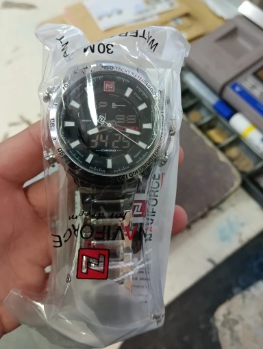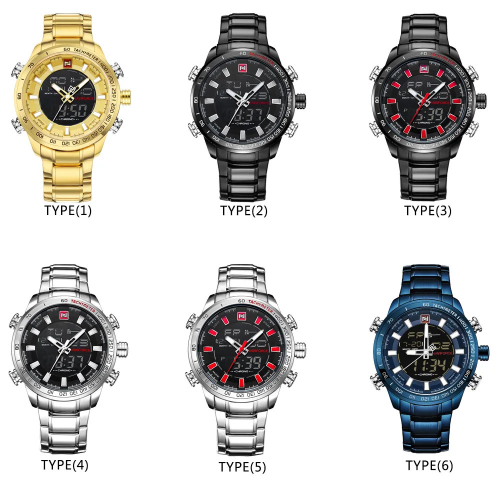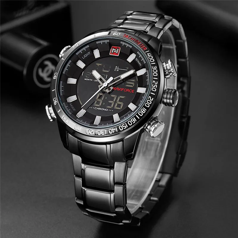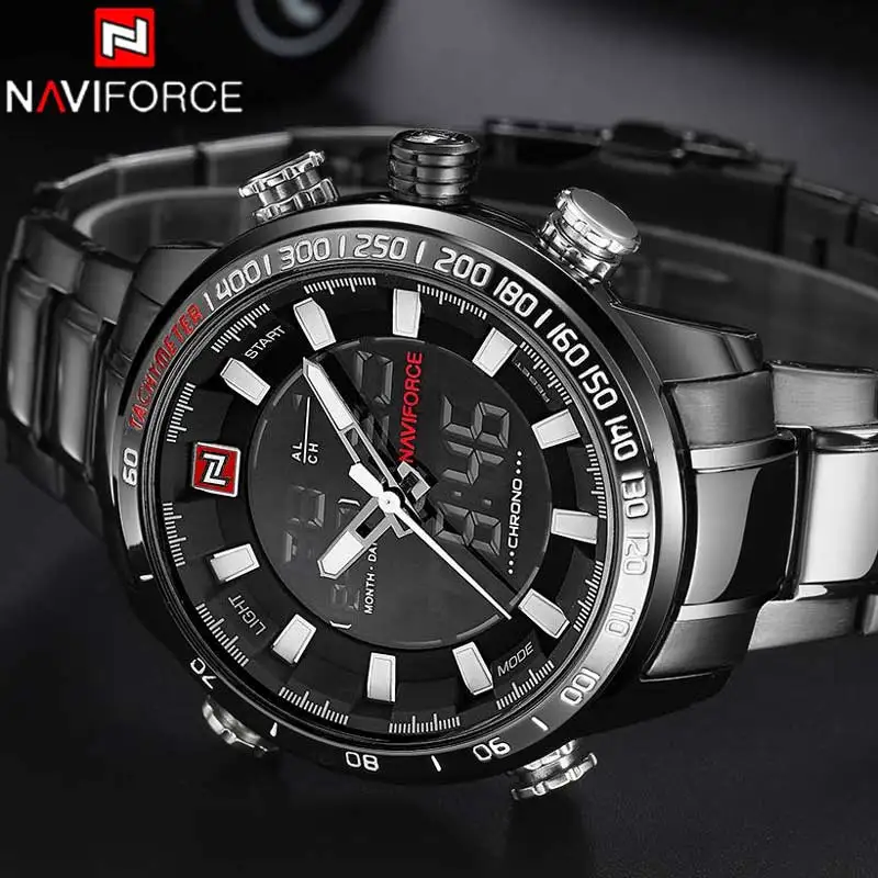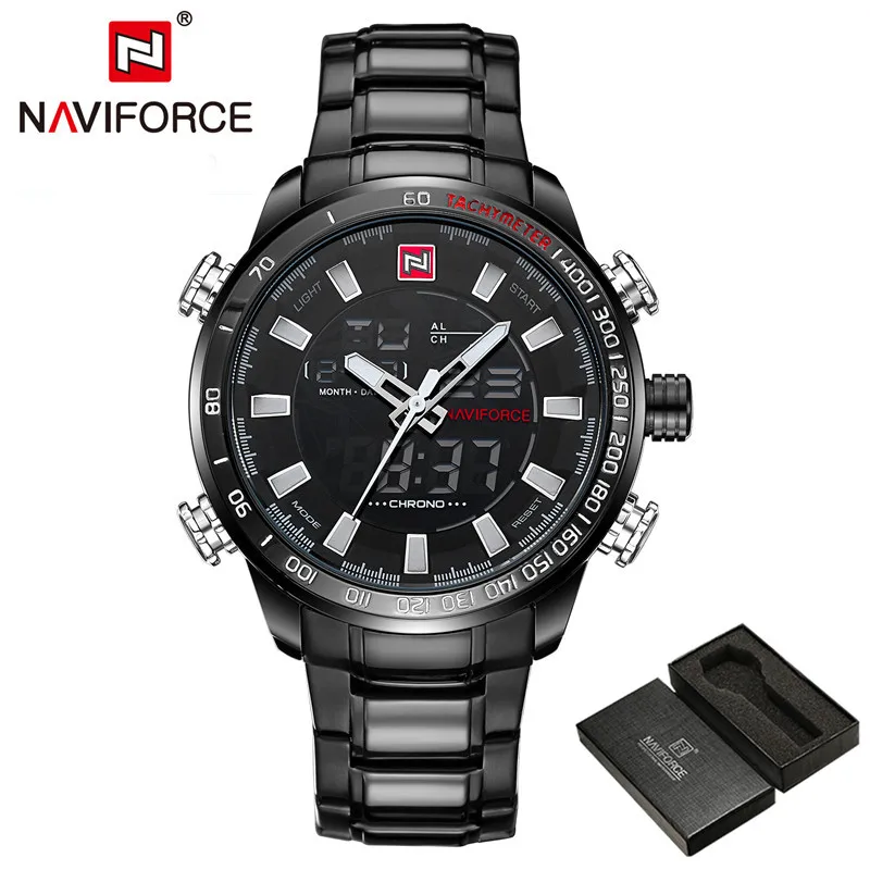 Часы наручные NAVIFORCE Мужские кварцевые, цифровые аналоговые спортивные брендовые Роскошные светодиодные в стиле милитари, из нержавеющей стали, 9093