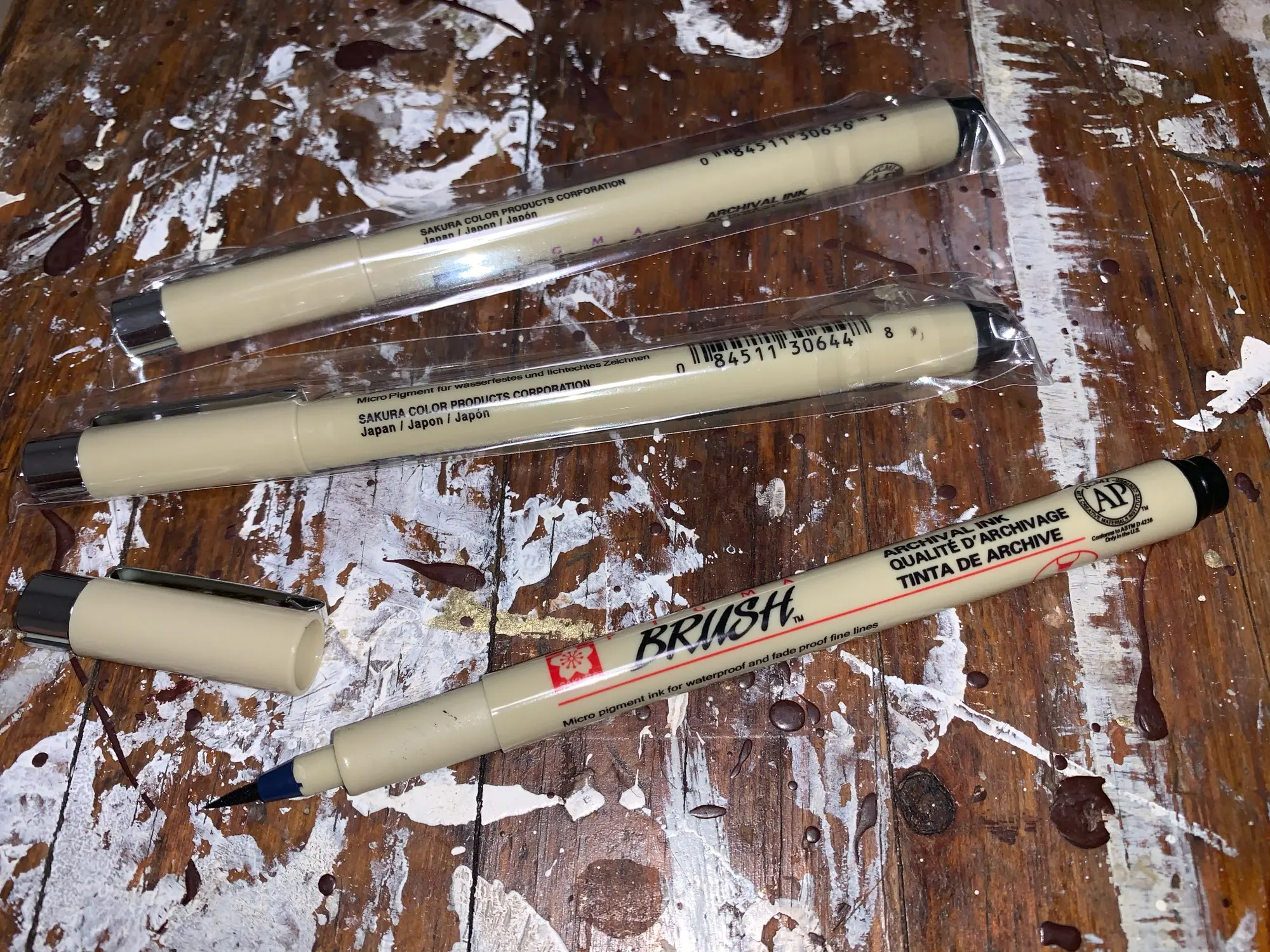 Товар пришел за указанное время, без повреждений. Вот несколько фото. На первом только дастала из пакета. Ручки были в индивидуальных чехлах. На второй - толщина линий на бумаге. На третьей - после контакта с водой чернила не растекаются и не оазмазываются на бумаге. Заказом довольна.