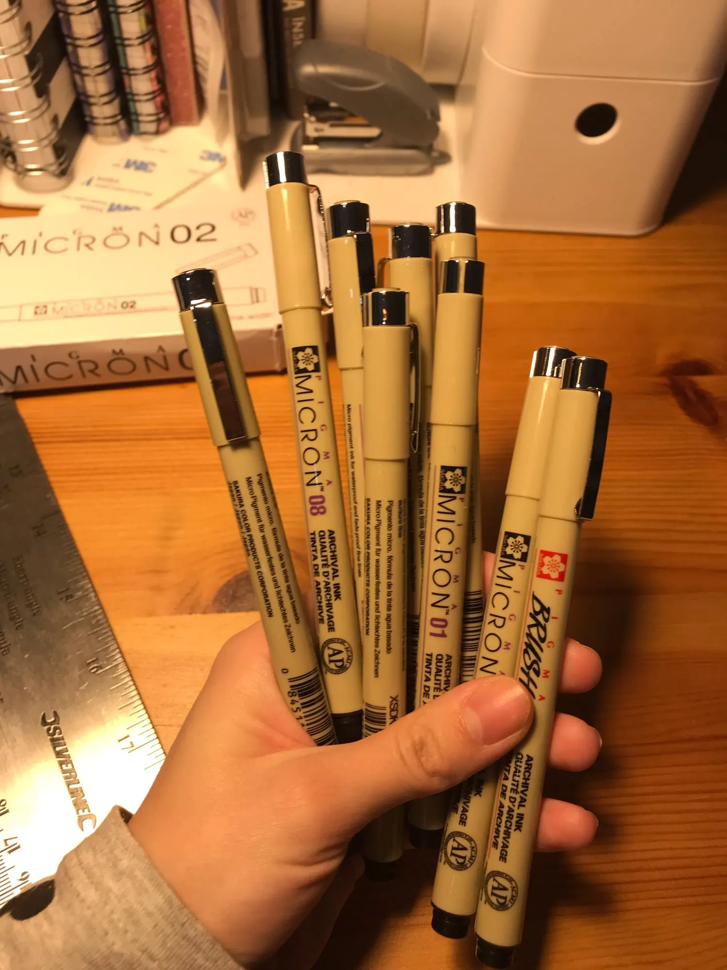 Все мои любимые ручки! Мне нравится их качество, и 0,5 мм-это мой любимый размер наконечника. Я использую эти ручки в основном для своего дневника, так как у меня есть ноутбук rollbahn, эта ручка является лучшей, и чернила не проходят через страницу! Доставка была невероятно быстрой, всего две недели!