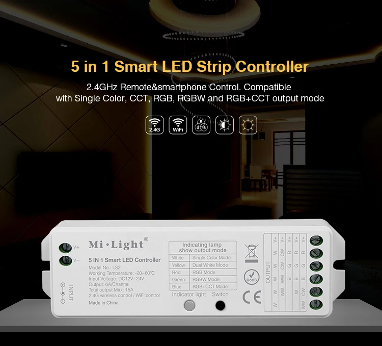 5 в 1 (один цвет и CCT & RGB & RGBW & RGB + CCT) умный контроллер-это наш недавно разработанный высококлассный светодиодный контроллер, управляемый беспроводным пультом дистанционного управления, также с управлением смартфоном и управлением на дальние расстояния 4G (требуется Wi-Fi коробка). Контроллер имеет функцию автоматической передачи и автоматической синхронизации, а также с режимом вывода яркости, CCT, RGB и RGBW и RGB + CCT. Этот контроллер принять широко используется 2,4 ГГц Беспроводная технология с особенностями низкого потребеление энергии, длинный сигнал передачи и сильный анти-помех и т. д. Один пульт дистанционного управления много контроллеров одновременно. Широко используется для управления освещением отеля и домашним освещением.