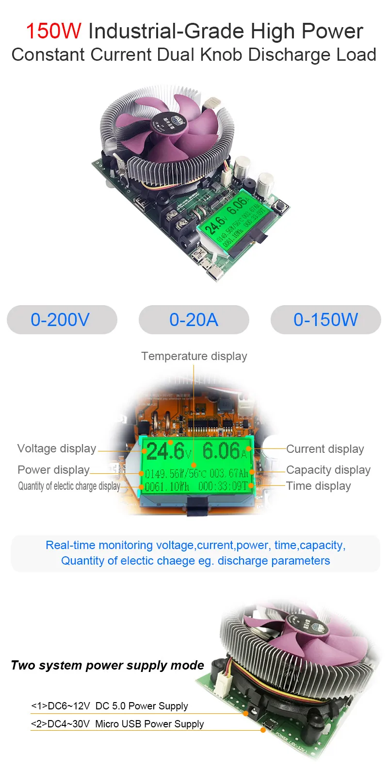 Цифровой вольтметр постоянного тока, 150 Вт180 Вт, Электронная нагрузка постоянного тока, 200 в, 20 А, диаметр измеритель расхода, тестер емкости автомобильного аккумулятора