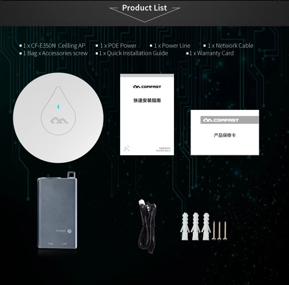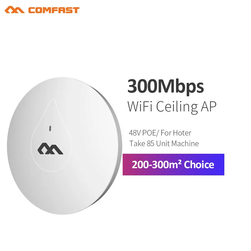 COMFAST CF-E335N 300 Мбит/с Высокая мощность poe потолок/настенный ap принять IEEE802.11n протокол беспроводной доступ технологии и старшего MIMO технологии, скорость передачи достигает 300 Мбит/с, и совместим с IEEE802.11b/g оборудования; технология питания POE может осуществлять передачу данных и источник питания для AP только с одним веб-кабелем, Потолочный дизайн и технология питания POE делают беспроводную сеть более легкой, она подходит для внутреннего беспроводного покрытия предприятий, школ, отелей и т. д. В то же время уникальная технология watchdog делает AP более стабильной и обеспечивает нормальную работу беспроводной сети в течение длительного времени.