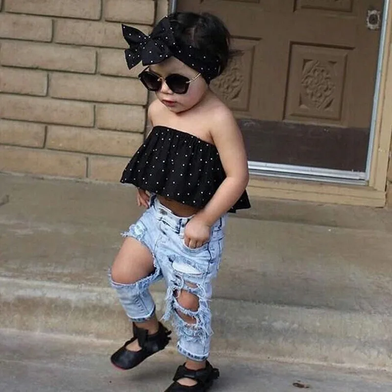 Набор детской одежды pudcoco в горошек, топы с открытыми плечами + джинсовые брюки с дырками + повязка на голову, комплект одежды из 3 предметов, уличный стиль