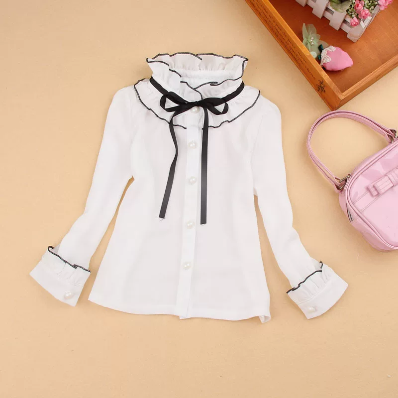 Белая блузка с оборками на воротнике для девочек на весну и осень, шифоновая Лоскутная Блузка с бантом для больших девочек, школьная рубашка с длинными рукавами для девочек, детские топы
