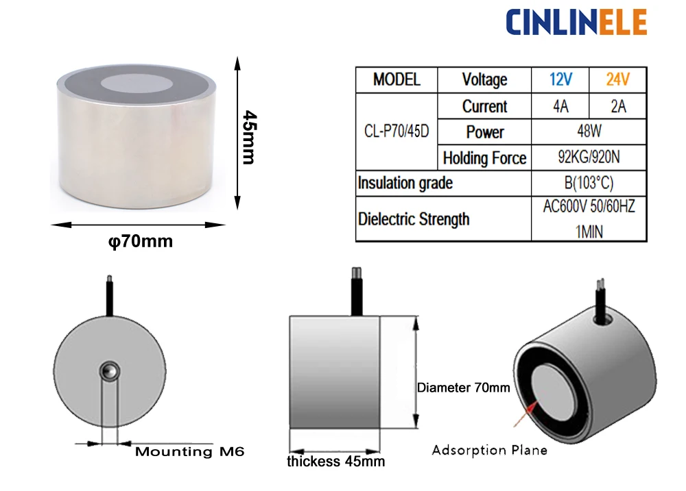 Магнит магнитный редкоземельный на присосках, электромагнит D70mm * H45mm 92KG 910N, DC 12V 24V