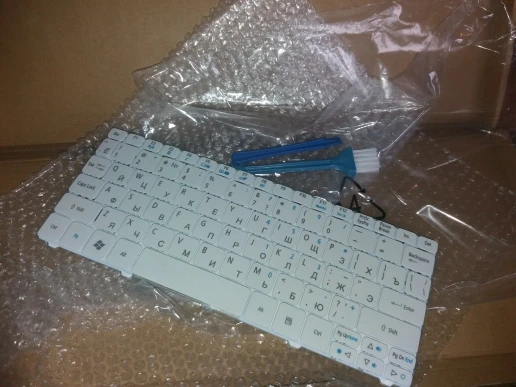 Упаковка оставляет желать лучшего. Тонкая картонная коробочка, которую слоупочта России по пути завязала в узел. Сама клавиатура соответствует описанию, хоть и сделана хлипковато. Перед установкой в нетбук пришлось выпрямлять. Всё на фото.