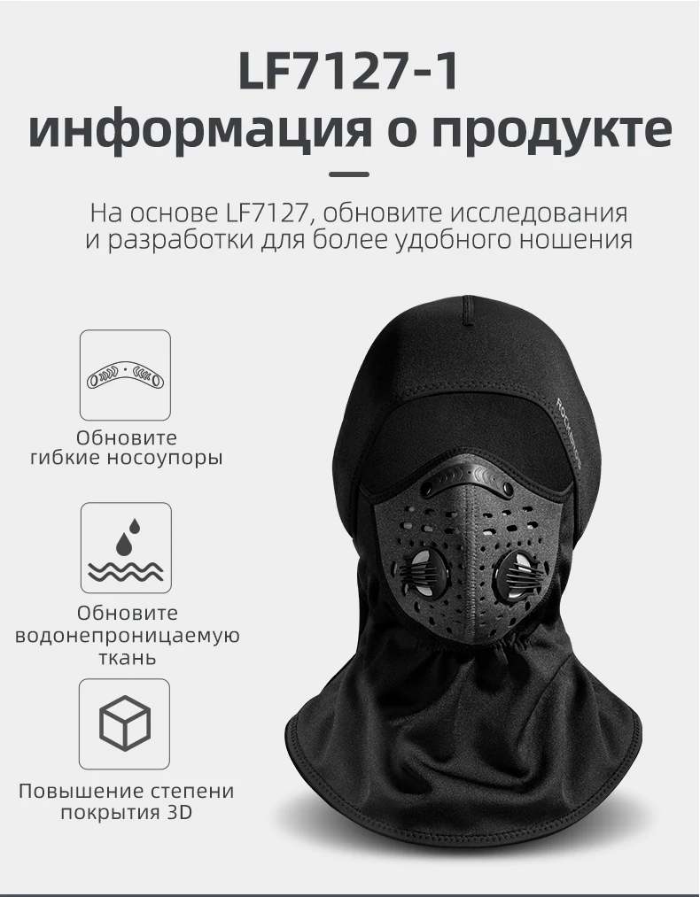 Модель LF7345BK из РФ. Сидит хорошо, но через нее дышать нереально. Никаких вентиляционных отверстий нет, а ткань такая плотная, что ее продуть невозможно. Только если спустить ниже носа и дышать носом. Защита только-только достает до плеч, у кого длинная шея.