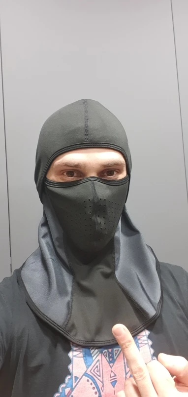 Отличная балаклава, даже очень теплая. Ветром не продувается, под дождем не мокнет. Немного ухудшается слышимость, но не критично. Пожалел, что не взял версию как у скорпиона (желтую). Закрывает плечи, шею всю. При желании можно легко опустить переднюю часть, чтобы покушать. Прорези для очков хорошие. По качеству вопросов нет.
