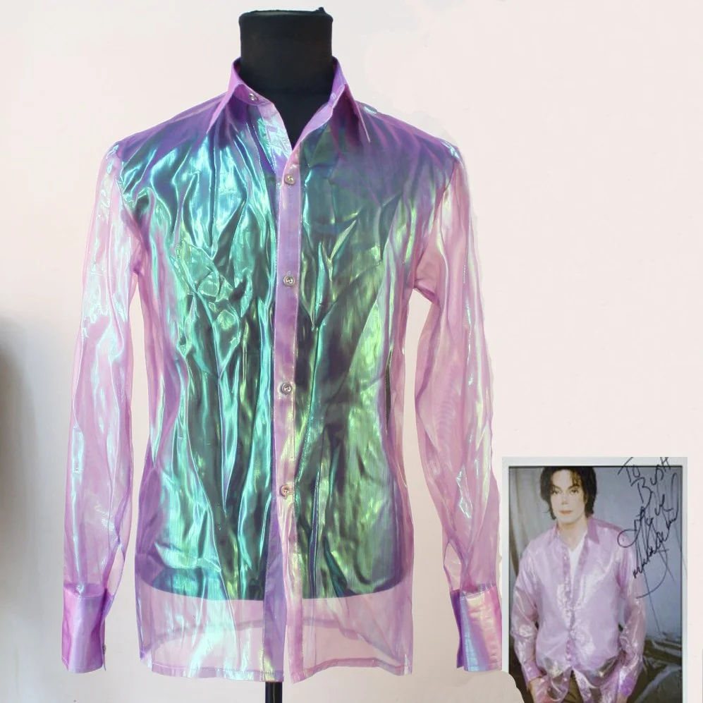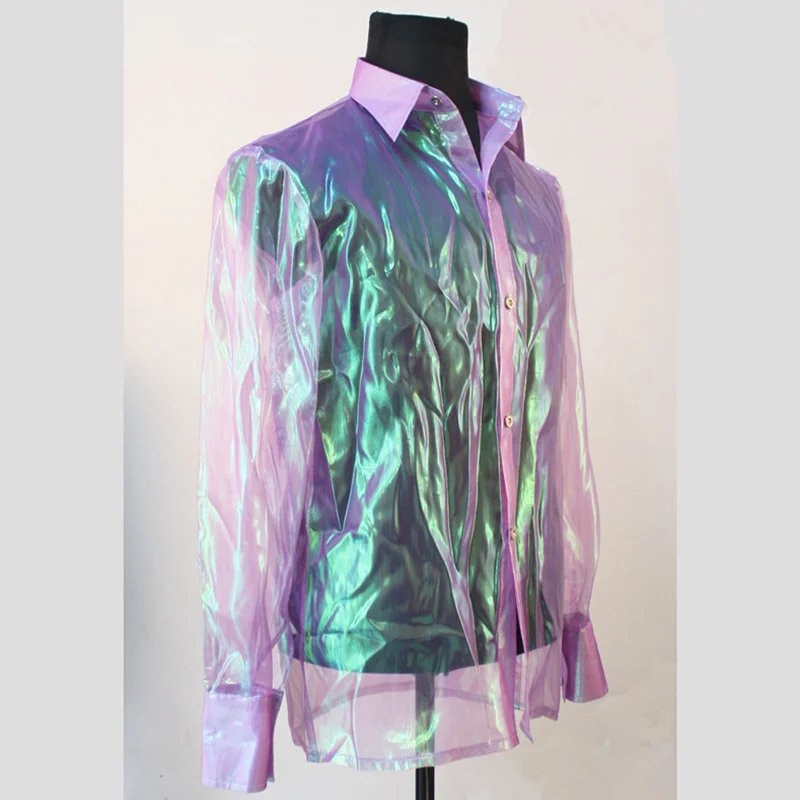 Радужная фиолетовая блестящая рубашка из органзы с длинными рукавами на пуговицах спередиИзображение
