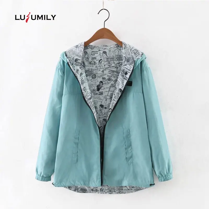 Lusumily 2021 Осенняя Женская Базовая куртка-бомбер с карманами на молнии с капюшоном двухсторонняя одежда с мультяшным принтом верхняя одежда Свободное пальто ветровка