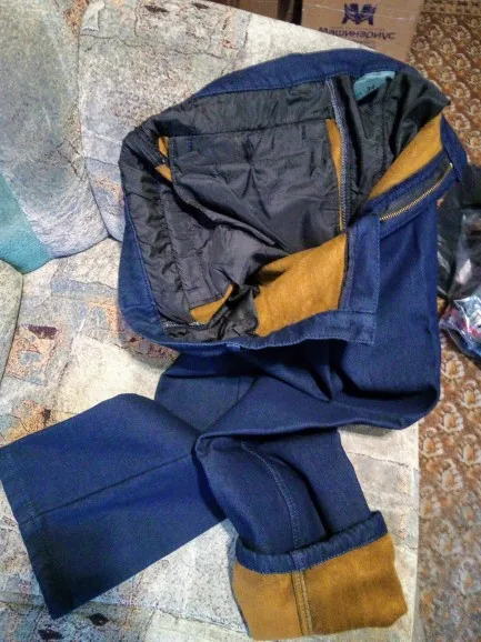 Молниеносная доставка. Оплатил 01, получил на почте 14 января. Зимний вариант джинсов тёмно синего цвета с утеплителем из флиса внутри, в полном объёме соответствует описанию. Джинсы пришли, упакованные в красивый пакет с зип застёжкой. Касаемо размера, продавец рекомендовал 33 размер, но остановились на 34, чтобы в холодные дни под джинсами носить нательное бельё. Теперь о главном: джинсы отличные, пошив шикарный, никаких торчащих ниток, по-видимому, изготовление фабричное. Материал плотный и добротный. Даже стрелки наглажены. Имеется 4 кармана, два спереди и два задних, на пуговицах. На мои габариты 182см/80кг, 34 размер подошёл немного свободно, как я и хотел. В общем, от доставки до качества товара, всё изумительно. Хочу отметить очень грамотного, отзывчивого, профессионала своего ремесла и надёжного продавца, китайского молодца, и выразить ему благодарность и признательность. Спасибо. Покупал со скидкой АлиЭкспресс за 1350 руб. Господа-товарищи, не гонитесь за дешовкой.